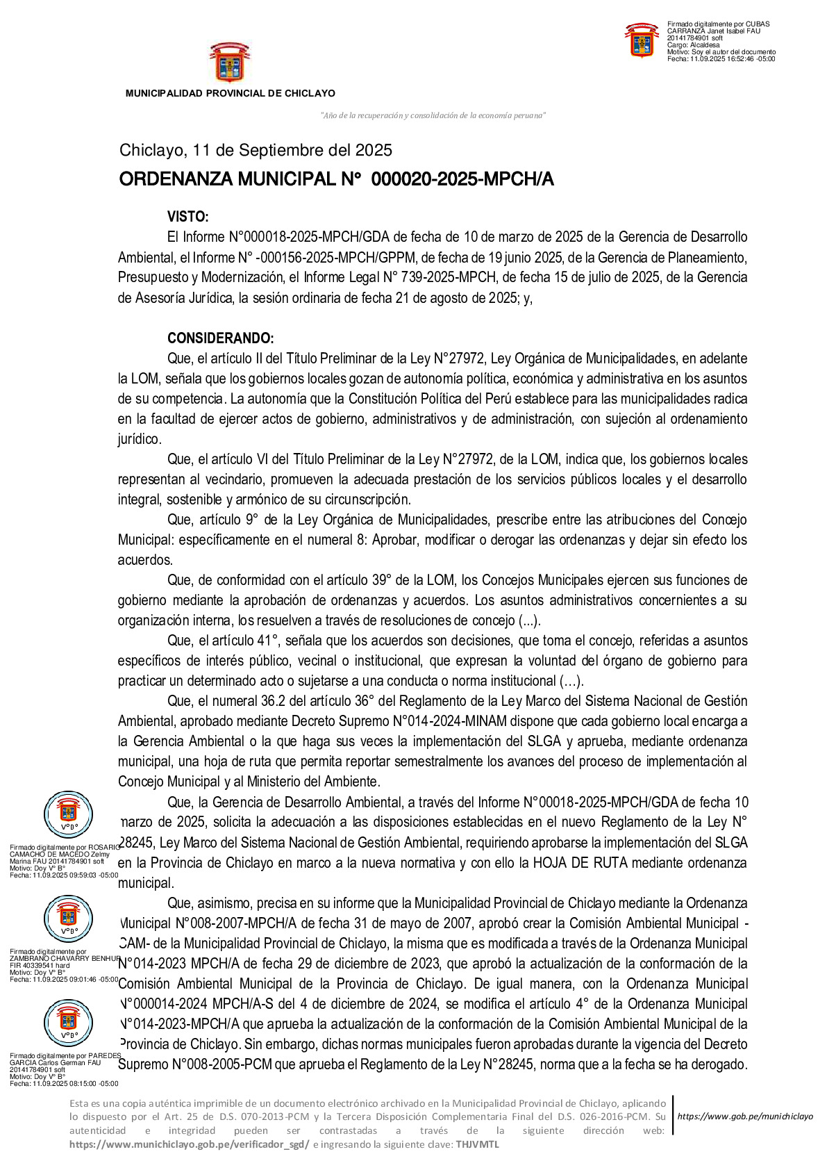 Ordenanza Municipal que aprueba la implementación del Sistema Local de Gestión Ambiental de la Municipalidad Provincial de Chiclayo y la hoja de ruta, como parte del proceso de implementación del Sistema Local de Gestión Ambiental, conforme al Reglamento de la Ley N.° 28245, Ley Marco del Sistema Nacional de Gestión Ambiental, aprobado por Decreto Supremo N.° 014-2024-MINAM.