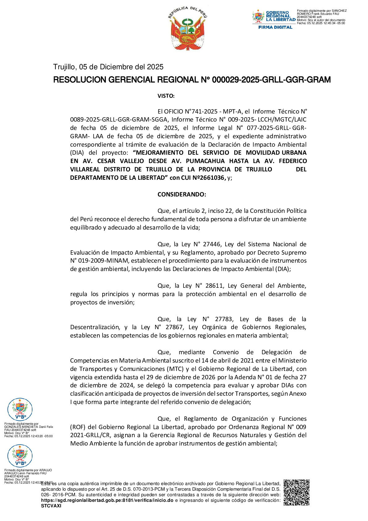 La Gerencia Regional del Ambiente, mediante RESOLUCION GERENCIAL REGIONAL N° 000029-2025-GRLL-GGR-GRAM, otorga la APROBACIÓN a la Declaración de Impacto Ambiental (DIA) del proyecto “MEJORAMIENTO DEL SERVICIO DE MOVILIDAD URBANA EN AV. CESAR VALLEJO DESDE AV. PUMACAHUA HASTA LA AV. FEDERICO VILLAREAL DISTRITO DE TRUJILLO DE LA PROVINCIA DE TRUJILLO DEL DEPARTAMENTO DE LA LIBERTAD”, presentado por la MUNICIPALIDAD PROVINCIAL DE TRUJILLO.
