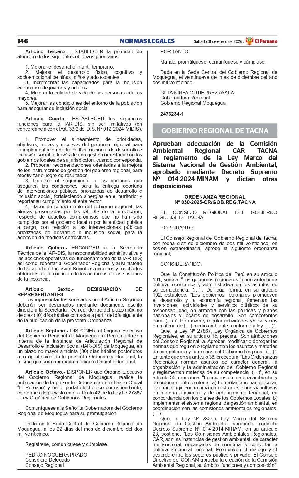 El Consejo Regional del Gobierno Regional de Tacna, en sesión extraordinaria, aprobó la siguiente ordenanza regional N° 030-2025-CR/GOB.REG.TACNA, que aprueba la adecuación de la Comisión Ambiental Regional CAR TACNA al reglamento de la Ley Marco del Sistema Nacional de Gestión Ambiental, aprobado mediante Decreto Supremo N° 014-2024-MINAM.