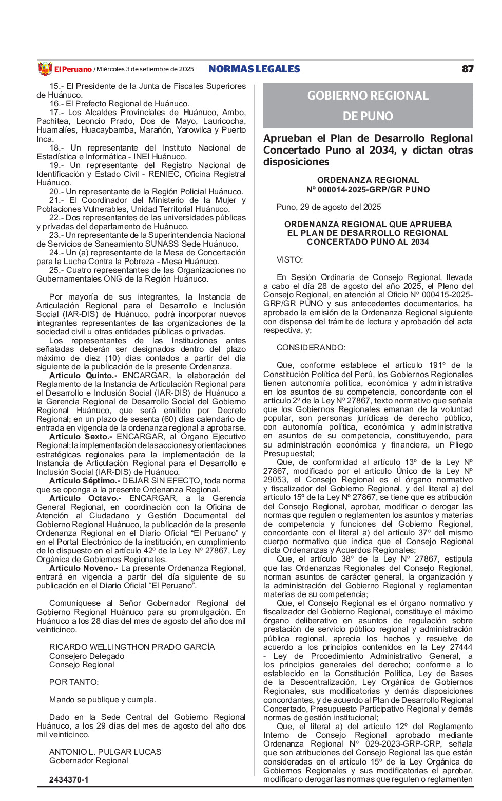 Se aprueba el nuevo Plan de Desarrollo Regional Concertado (PDRC) Puno al 2034, que consta de 3 capítulos y anexos.