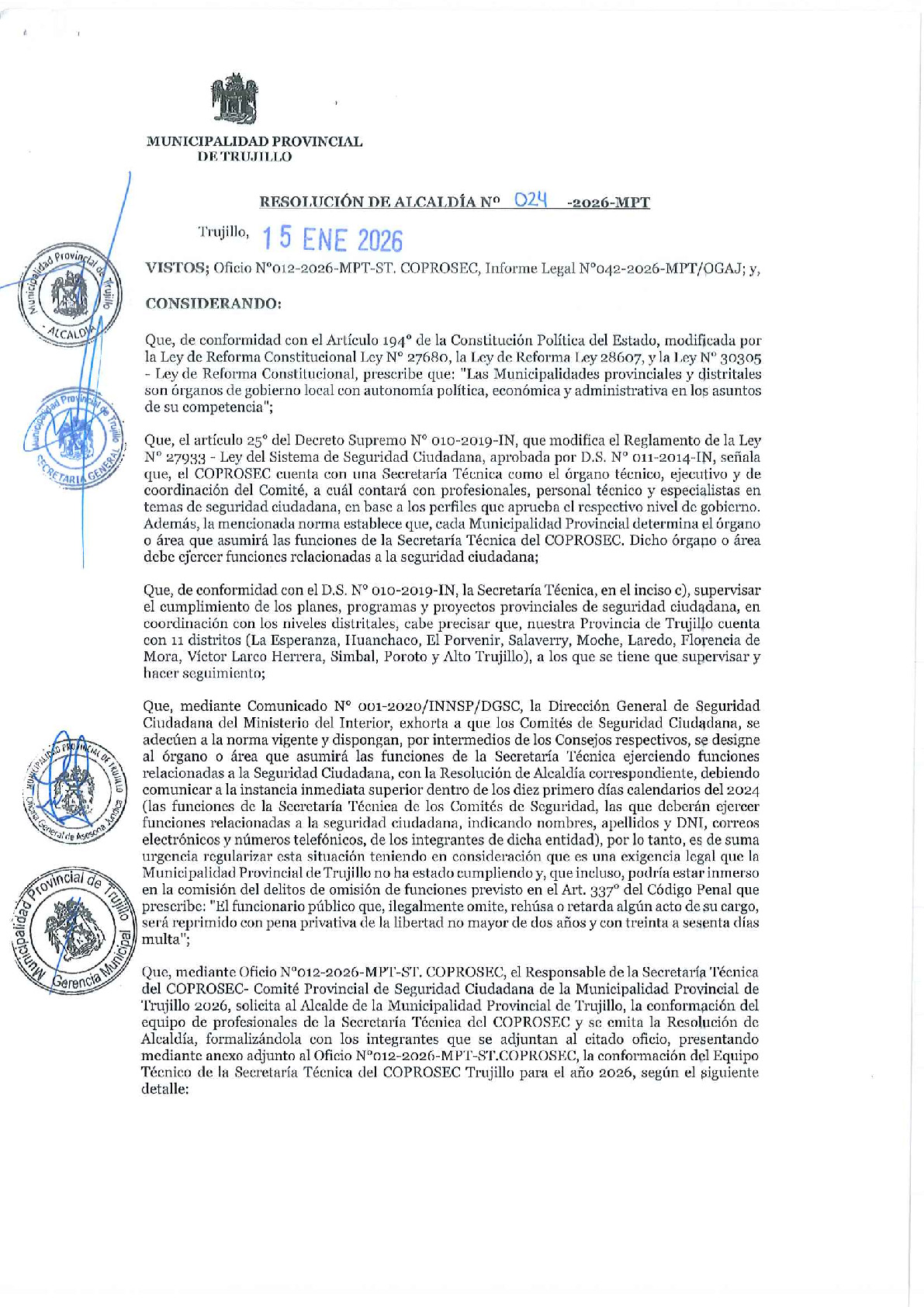Conformar el equipo de profesionales de la Secretaria técnica de COPROSEC 2026, efectuado por el Responsable de la Secretaria Técnica de COPROSEC - Comité Provincial de Seguridad Ciudadana de la Municipalidad Provincial de Trujillo.