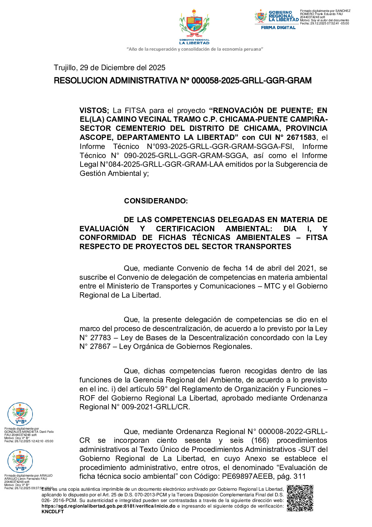 La Gerencia Regional del Ambiente, mediante RESOLUCION ADMINISTRATIVA N° 000058-2025-GRLL-GGR-GRAM, otorga la CONFORMIDAD a la Ficha Técnica Socio Ambiental (FITSA) del proyecto “RENOVACIÓN DE PUENTE; EN EL(LA) CAMINO VECINAL TRAMO C.P. CHICAMA-PUENTE CAMPIÑA- SECTOR CEMENTERIO DEL DISTRITO DE CHICAMA, PROVINCIA ASCOPE, DEPARTAMENTO LA LIBERTAD” con CUI N° 2671583.