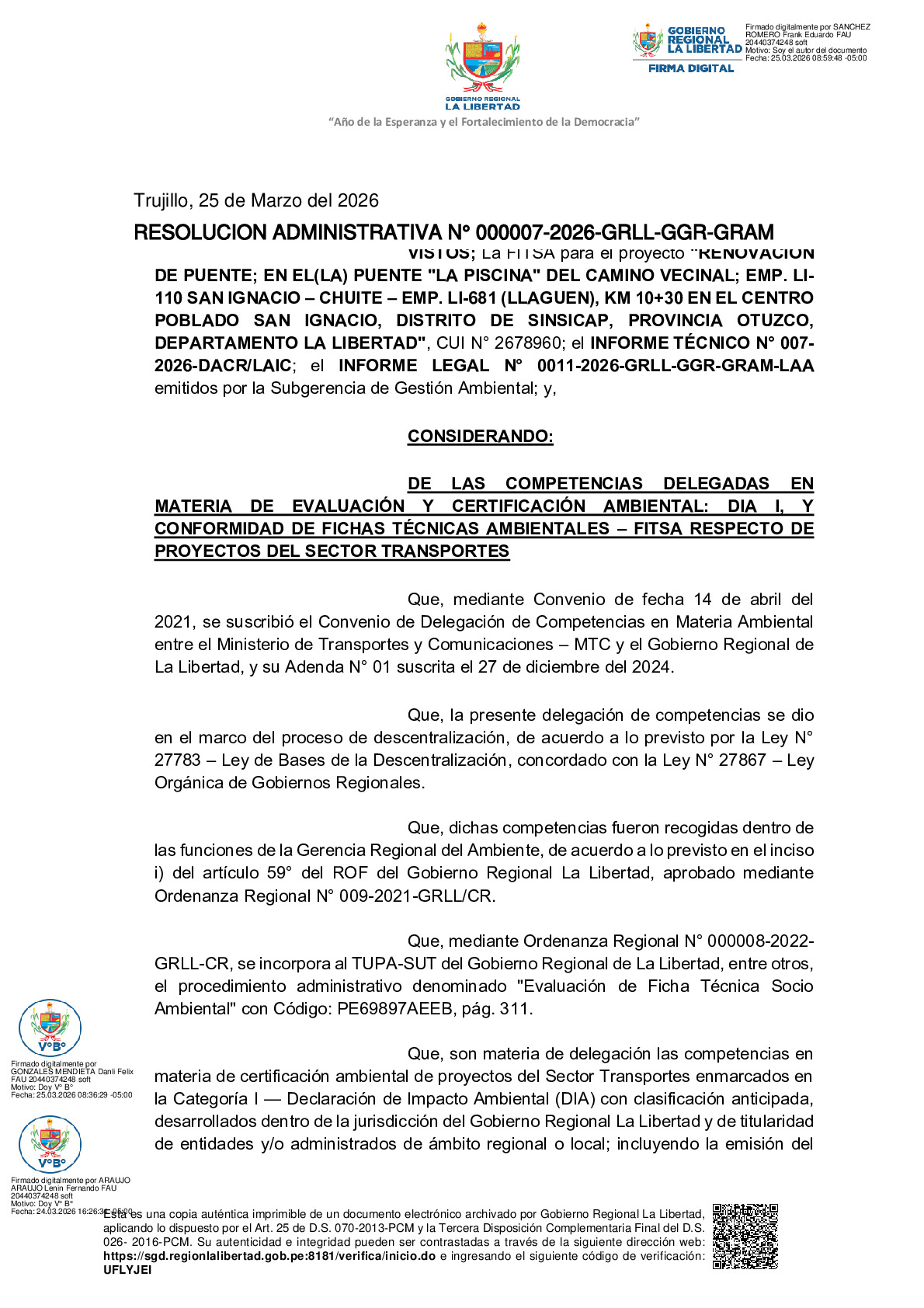 La Gerencia Regional del Ambiente, mediante RESOLUCION ADMINISTRATIVA N° 000007-2026-GRLL-GGR-GRAM, otorga la CONFORMIDAD a la Ficha Técnica Socio Ambiental (FITSA) del proyecto “RENOVACION DE PUENTE; EN EL(LA) PUENTE "LA PISCINA" DEL CAMINO VECINAL; EMP. LI-110 SAN IGNACIO – CHUITE – EMP. LI-681 (LLAGUEN), KM 10+30 EN EL CENTRO POBLADO SAN IGNACIO, DISTRITO DE SINSICAP, PROVINCIA OTUZCO, DEPARTAMENTO LA LIBERTAD” con CUI N° 2678960, presentado por la Municipalidad Distrital de Sinsicap.