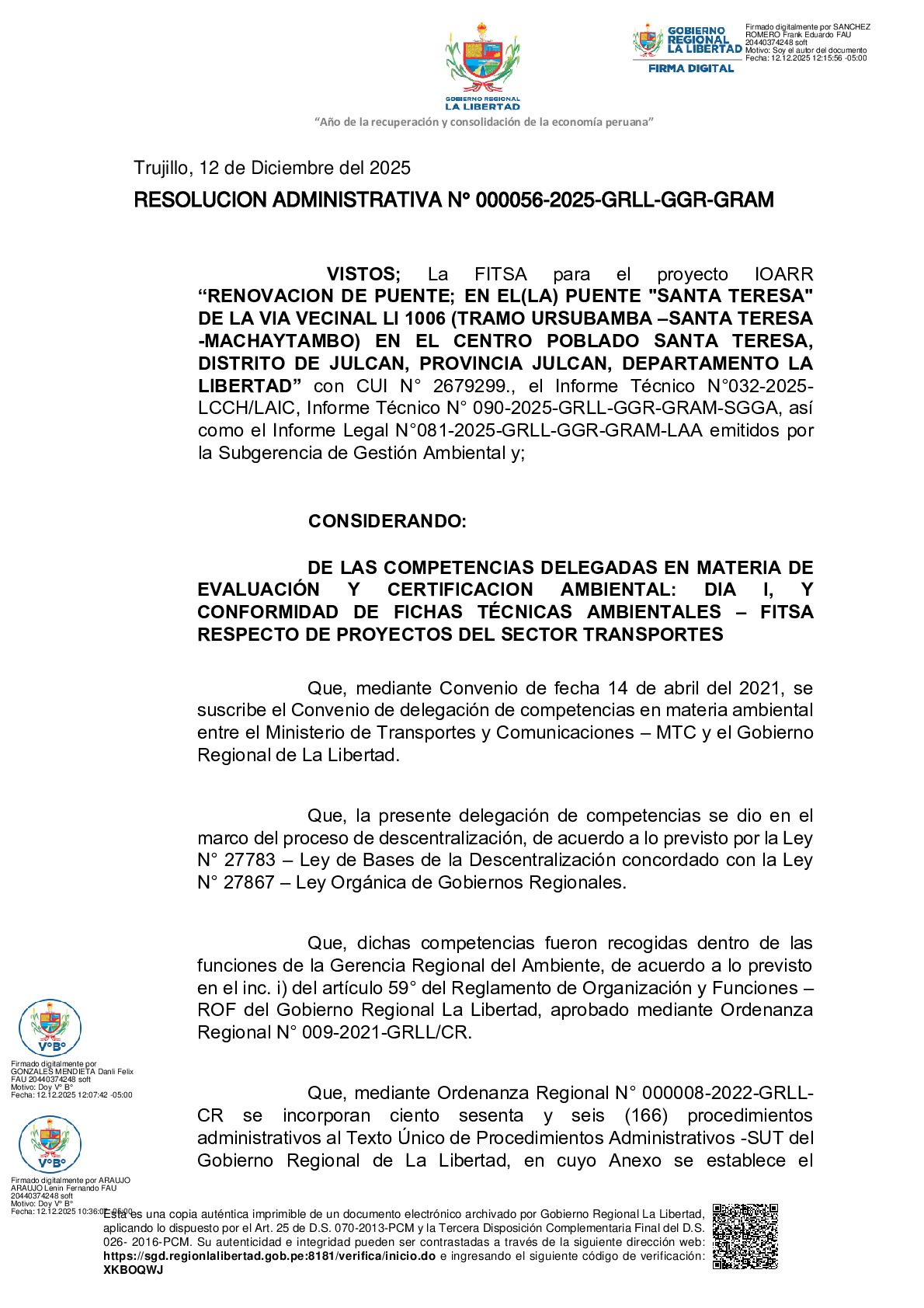 La Gerencia Regional del Ambiente, mediante RESOLUCION ADMINISTRATIVA N° 000056-2025-GRLL-GGR-GRAM, otorga la CONFORMIDAD a la Ficha Técnica Socio Ambiental (FITSA) del proyecto “RENOVACION DE PUENTE; EN EL(LA) PUENTE "SANTA TERESA" DE LA VIA VECINAL LI-1006 (TRAMO URSUBAMBA – SANTA TERESA - MACHAYTAMBO) EN EL CENTRO POBLADO SANTA TERESA, DISTRITO DE JULCAN, PROVINCIA JULCAN, DEPARTAMENTO LA LIBERTAD” con CUI N° 2679299.