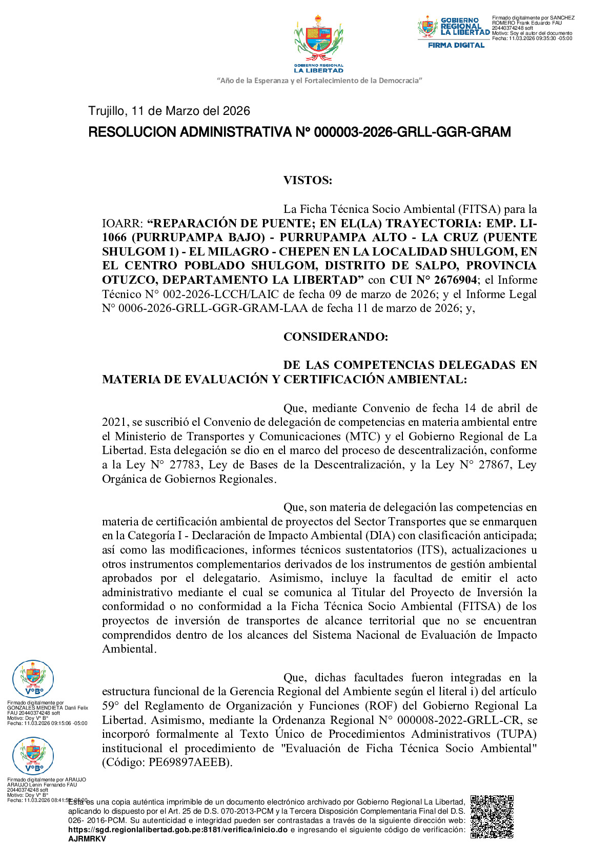 La Gerencia Regional del Ambiente, mediante RESOLUCION ADMINISTRATIVA N° 000003-2026-GRLL-GGR-GRAM, otorga la CONFORMIDAD a la Ficha Técnica Socio Ambiental (FITSA) del proyecto “REPARACIÓN DE PUENTE; EN EL(LA) TRAYECTORIA: EMP. LI-1066 (PURRUPAMPA BAJO) - PURRUPAMPA ALTO - LA CRUZ (PUENTE SHULGOM 1) - EL MILAGRO - CHEPEN EN LA LOCALIDAD SHULGOM, EN EL CENTRO POBLADO SHULGOM, DISTRITO DE SALPO, PROVINCIA OTUZCO, DEPARTAMENTO LA LIBERTAD” con CUI N° 2676904, presentada por la Municipalidad Distrital de Salpo.
