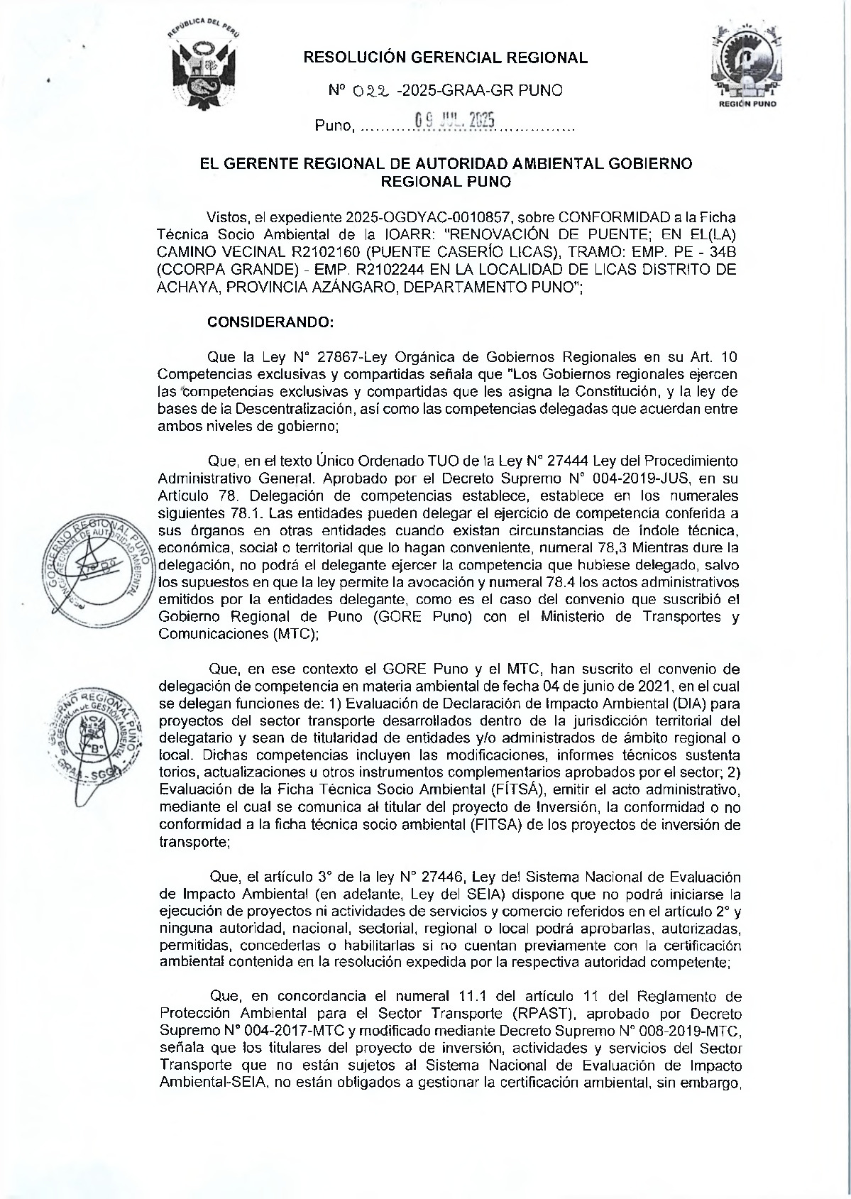 OTORGAR la CONFORMIDAD a la Ficha Técnica Socio Ambiental de la IOARR: "RENOVACIÓN DE PUENTE; EN EL(LA) CAMINO VECINAL R2102160 (PUENTE CASERÍO LICAS), TRAMO: EMP. PE - 34B (CCORPA GRANDE) - EMP. R2102244 EN LA LOCALIDAD DE LICAS DISTRITO DE ACHAYA, PROVINCIA AZÁNGARO, DEPARTAMENTO PUNO" con CUI 2605439, conforme a las consideraciones expuestas en la presente Resolución Gerencial Regional.