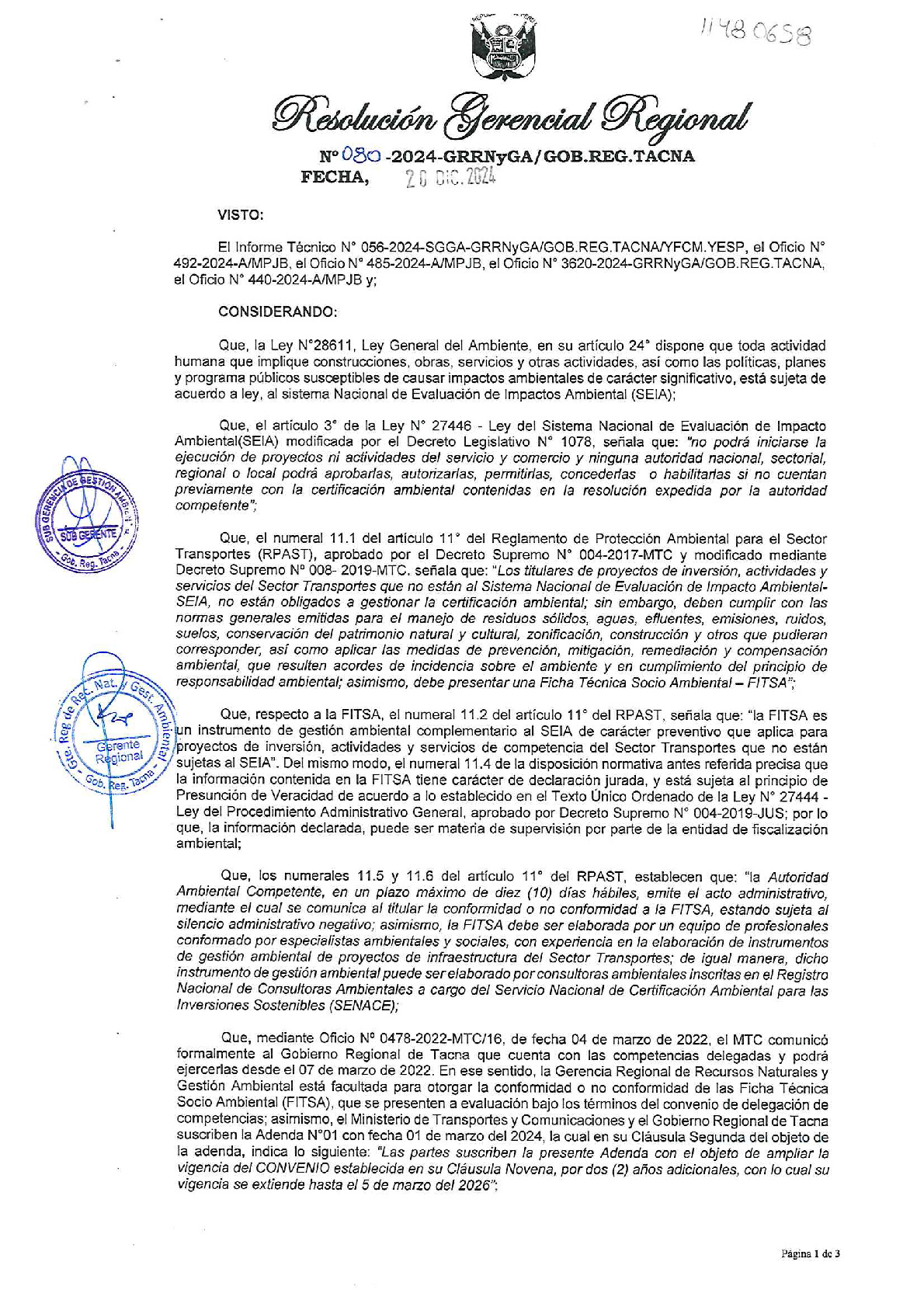 La presente Resolución otorga la conformidad a la Ficha Técnica Socio Ambiental del proyecto: “Mejoramiento del Servicio de Movilidad Urbana del Pasaje 30 de Agosto de la Asociación de Vivienda Viñas del Sur, Distrito de Locumba - Provincia de Jorge Basadre - Departamento de Tacna” con CUI N° 2568450 presentado por la Municipalidad Provincial Jorge Basadre, por las consideraciones expuestas en la presente resolución.