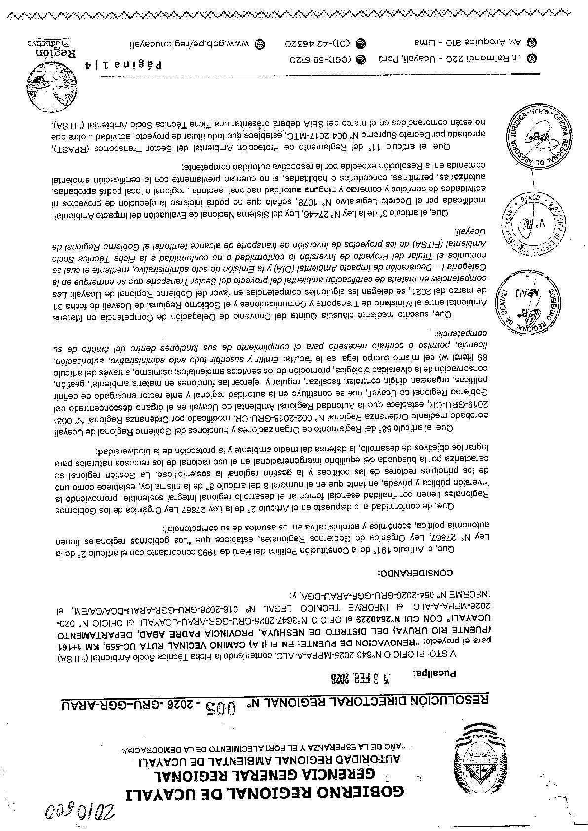 El Gobierno Regional de Ucayali, a través de la Autoridad Regional Ambiental de Ucayali, otorga la Conformidad al FITSA para el proyecto: "RENOVACION DE PUENTE; EN EL (LA) CAMINO RUTA UC-559, KM 1+161 (PUENTE RIO URUYA) DEL DISTRITO DE NESHUYA, PROVINCIA PADRE ABAD, DEPARTAMENTO DE UCAYALI" CON CUI: N°2640229