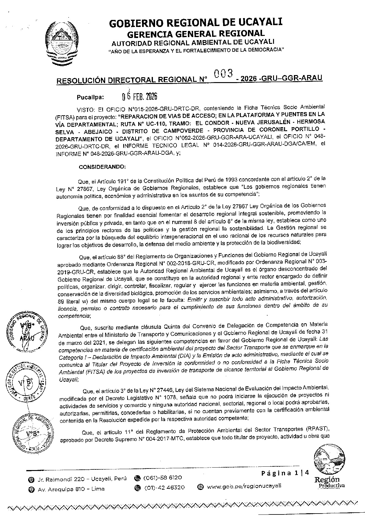 El Gobierno Regional de Ucayali, a través de la Autoridad Regional Ambiental de Ucayali, otorga la Conformidad al FITSA para el proyecto: «"REPARACION DE VIAS ACCESO: EN LA PLATAFORMA Y PUENTES EN LA VIA DEPARTAMENTAL; RUTA N° UC-110, TRAMO: EL CONDOR-NUEVA JERUSALEN-HERMOSA SELVA-ABEJAICO-DIST. CAMPO VERDE-PROV. CORONEL PORTILLO-DPTO. UCAYALI