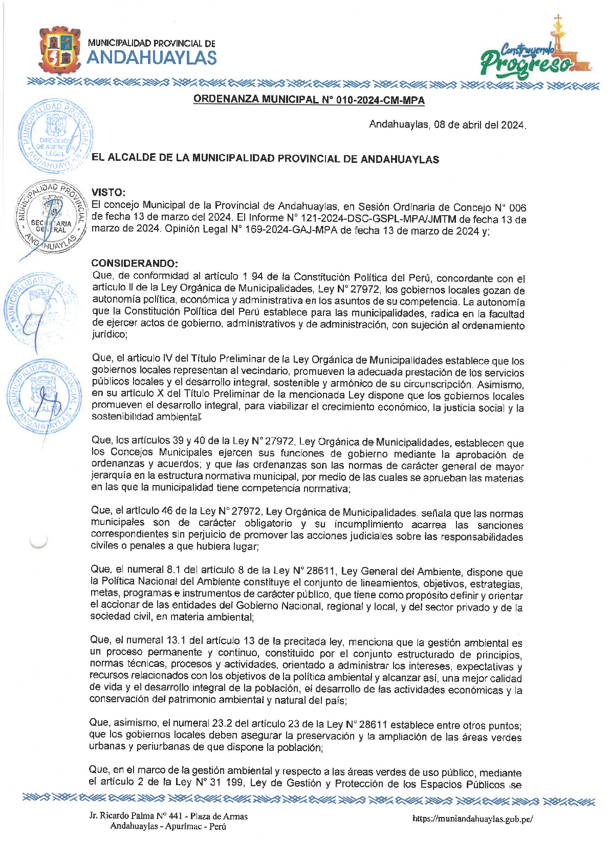 ARTICULO PRIMERO.- APROBAR LA Ordenanza municipal que reglamento la conservación y gestión de las áreas verdes de uso publico en la provincia de Andahuaylas, que consta de quince (15) artículos, dos (02) disposiciones complementarias finales y cuatro (04) disposiciones completarías modificatorias, el mismo como anexo, forma parte integrante de la presente ordenanza.