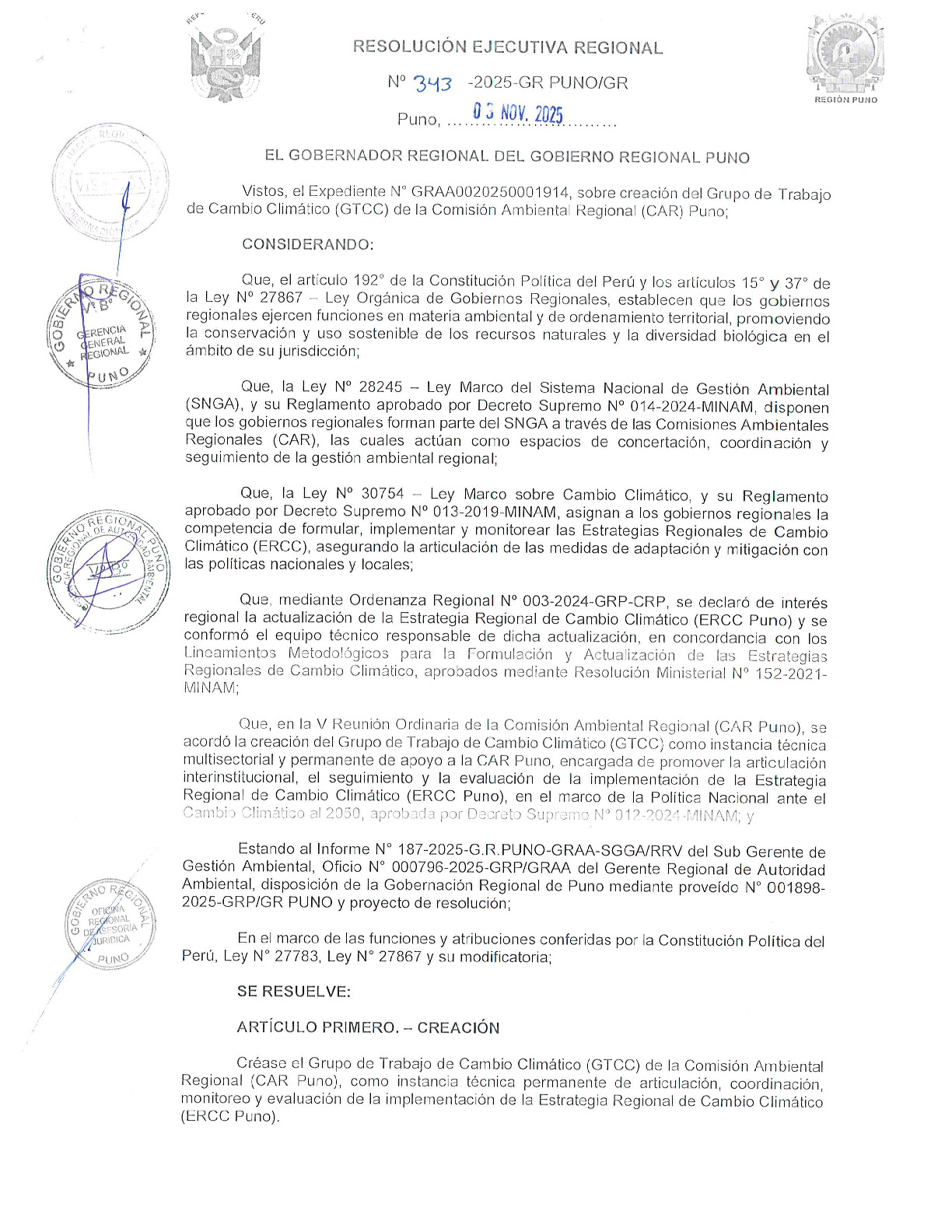 Créase el Grupo de Trabajo de Cambio Climático /GTCC) de la Comisión Ambiental Regional (CAR Puno), como instancia técnica permanente de articulación, coordinación, monitoreo y evaluación de la implementación de la Estrategia Regional de Cambio Climático (ERCC Puno).