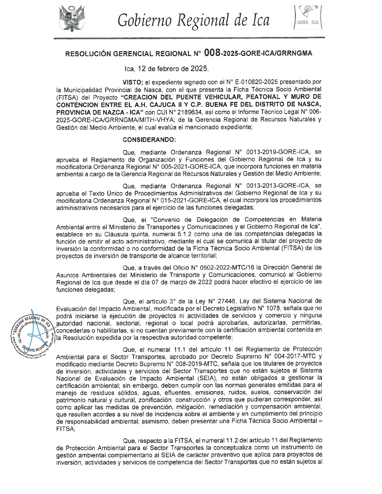 CREACION DEL PUENTE VEHICULAR, PEATONAL Y MURO DE CONTENCION ENTRE EL A.H. CAJUCA II Y C.P. BUENA FE DEL DISTRITO DE NASCA, PROVINCIA DE NAZCA - ICA