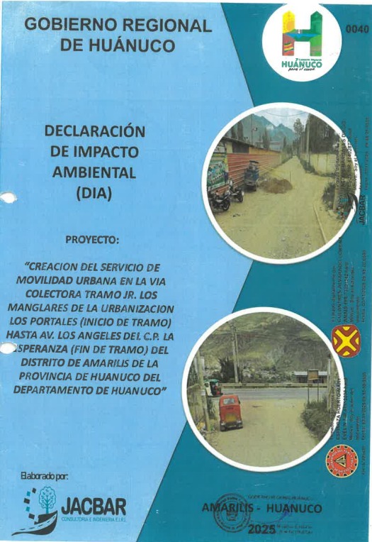 El Gobierno Regional de Huánuco, a través de la Gerencia Regional de Recursos Naturales y Gestión Ambiental, APRUEBA la Declaración de Impacto Ambiental (DIA) para el proyecto “Creación del Servicio de Movilidad Urbana en la Vía Colectora”, tramo comprendido desde Jr. Los Manglares de la Urbanización Los Portales hasta Av. Los Ángeles del C.P. La Esperanza, en el distrito de Amarilis, Huánuco. Este proyecto, con CUI N°2682115, presentado por la Gerencia Regional de Infraestructura, ha superado satisfactoriamente el proceso de evaluación técnica y legal, incluyendo la subsanación de observaciones, conforme a la normativa ambiental vigente.