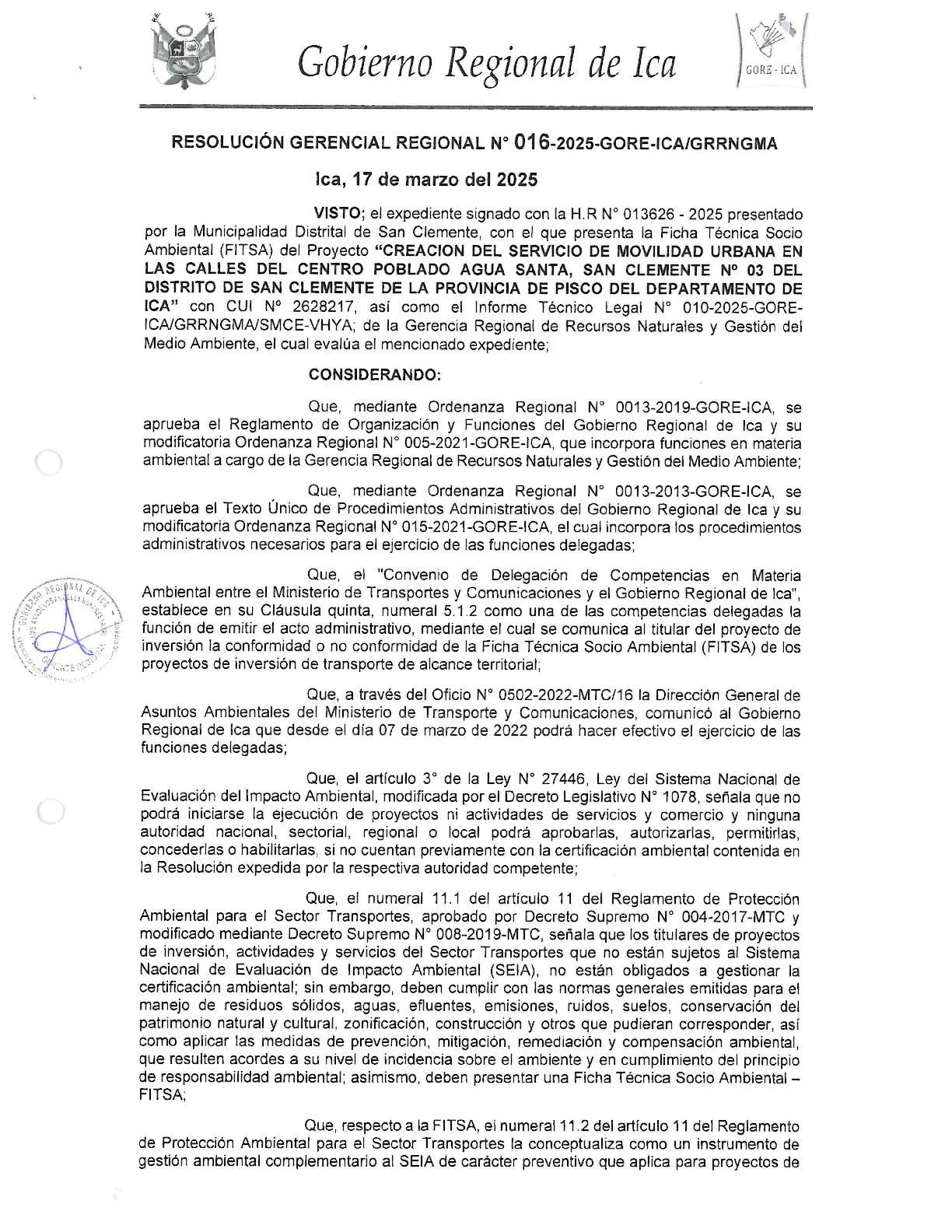 CONFORMIDAD A LA FICHA TECNICA SOCIO AMBIENTAL FITSA DEL PROYECTO"CREACION DEL SERVICIO DE MOVILIDAD URBANA EN LAS CALLES DEL CENTRO POBLADO AGUA SANTA, SAN CLEMENTE Nº 03 DEL DISTRITO DE SAN CLEMENTE DE LA PROVINCIA DE PISCO DEL DEPARTAMENTO DE ICA" con N° CUI 2628217