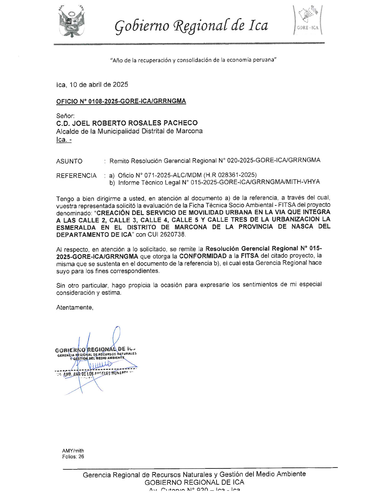 CONFORMIDAD A LA FICHA TECNICA SOCIO AMBIENTAL FITSA DEL PROYECTO"CREACION DEL SERVICIO DE MOVILIDAD URBANA EN LA VÍA QUE INTEGRA A LAS CALLE 2, CALLE 3, CALLE 4, CALLE 5 Y CALLE TRES DE LA URBANIZACIÓN LA ESMERALDA EN EL DISTRITO DE MARCONA DE LA PROVINCIA DE NASCA DEL DEPARTAMENTO DE ICA" con CUI N° 2620738