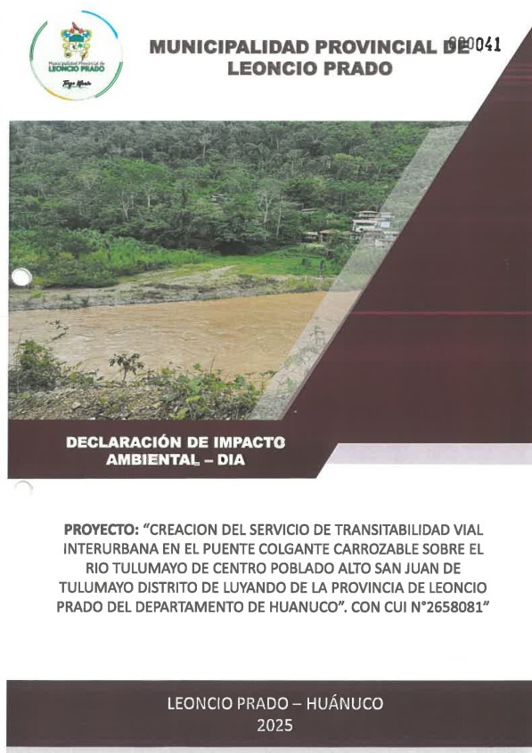 Creación del servicio de transitabilidad vial interurbana en el puente colgante Carrozable sobre el rio Tulumayo de Centro Poblado Alto San Juan De Tulumayo Distrito de Luyando de la Provincia de Leoncio Prado del Departamento de Huánuco