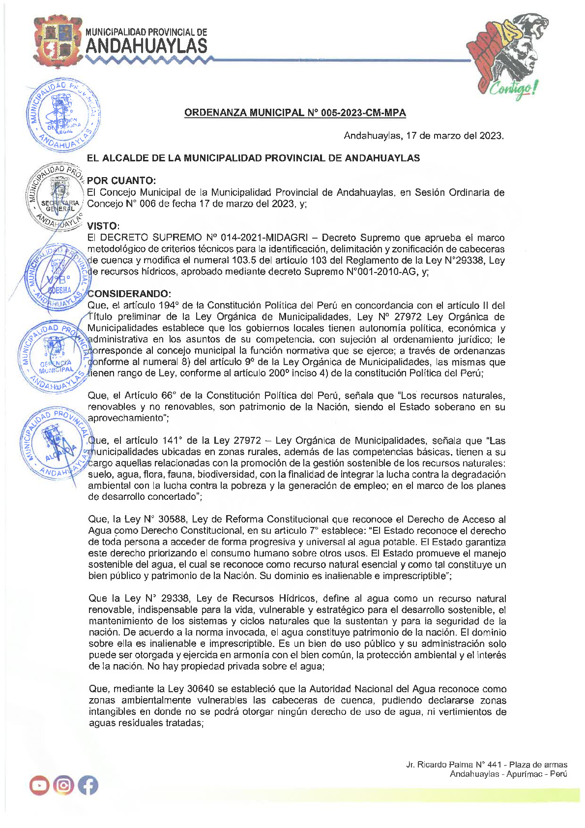 Declara en Emergencia e Interés Provincial los Recursos Hídricos del Ámbito de la Provincia de Andahuaylas