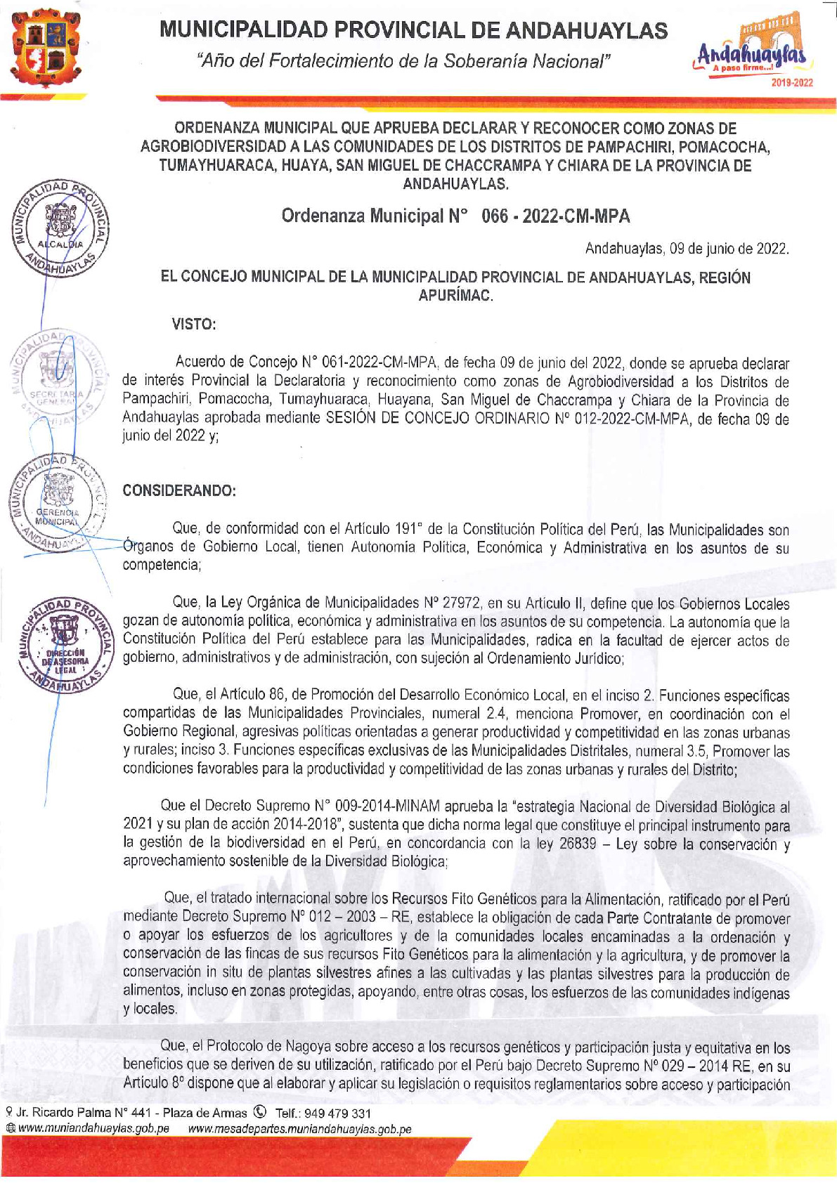DECLARAR Y RECONOCER COMO ZONAS DE AGROBIODIVERSIDAD A LAS COMUNIDADES DE LOS DISTRITOS DE PAMPACHIRI, POMCACHA, TUMAYHUARACA, HUAYANA, SAN MIGUEL DE CHACCRAMPA Y CHIARA de la Provincia de ANDAHUAYLAS. Para CONTRIBUIR con el mantenimiento del reconocimiento de zonas de Agrobiodiversidad, la diversidad genética, conocimientos tradicionales del reconocimiento de zonas Agrobiodiversidad, la diversidad genética, conocimientos tradicionales y las practicas socioculturales e idiomáticas enmarcadas en la gestión integral de los recursos naturales.