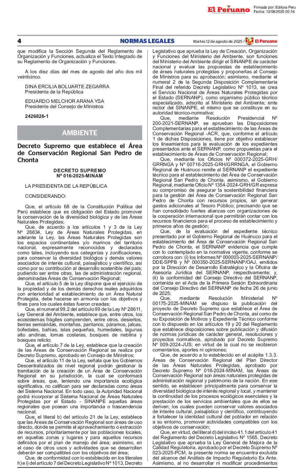 Decreto Supremo que establece el Área de Conservación Regional San Pedro de Chonta