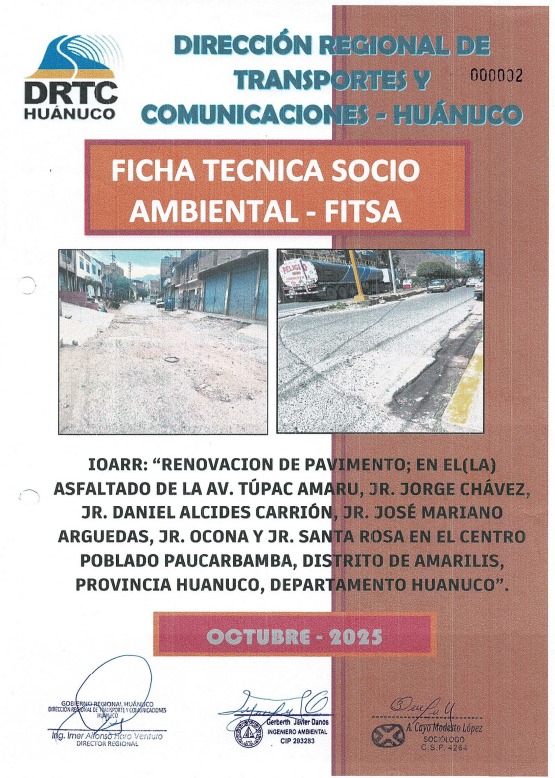 FITSA: IOARR "Renovación de pavimento; en el (la) asfaltado de la Av. Túpac Amaru, Jr. Jorge Chávez, Jr. Daniel Alcides Carrión, Jr. José Mariano Arguedas, Jr. Ocona y Jr. Santa Rosa en el centro poblado Paucarbamba, Distrito de Amarilis, Provincia Huánuc