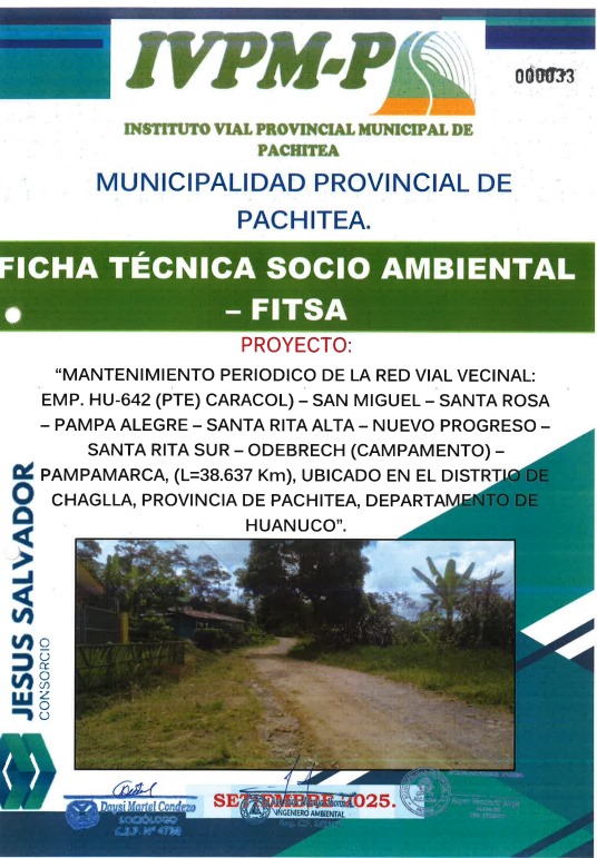 l proyecto "MANTENIMIENTO PERIODICO DE LA RED VIAL VECINAL: EMP. HU-642 (PTE) CARACOL) - SAN MIGUEL - SANTA ROSA - PAMPA ALEGRE - SANTA RITA ALTA - NUEVO PROGRESO - SANTA RITA SUR - ODEBRECH (CAMPAMENTO) - PAMPAMARCA, (L=38.637 Km), UBICADO EN EL DISTRTIO DE CHAGLLA, PROVINCIA DE PACHITEA, DEPARTAMENTO DE HUANUCO"., con una longitud de 38.637 km, es una vía de comunicación esencial para el tránsito de personas y servicios de las localidades que interconectan el proyecto.