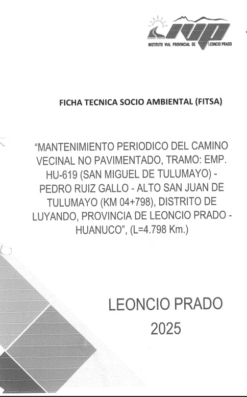 FITSA: Mantenimiento periódico del camino vecinal no pavimentado, Tram: Emp. Hu-619 (San Miguel de Tulumayo)- Pedro Ruiz Gallo- Alto San Juan de Tulumayo (Km 04+798). Distrito de Luyando, Provincia de Leoncio Prado Huánuco" (L=4.798)
