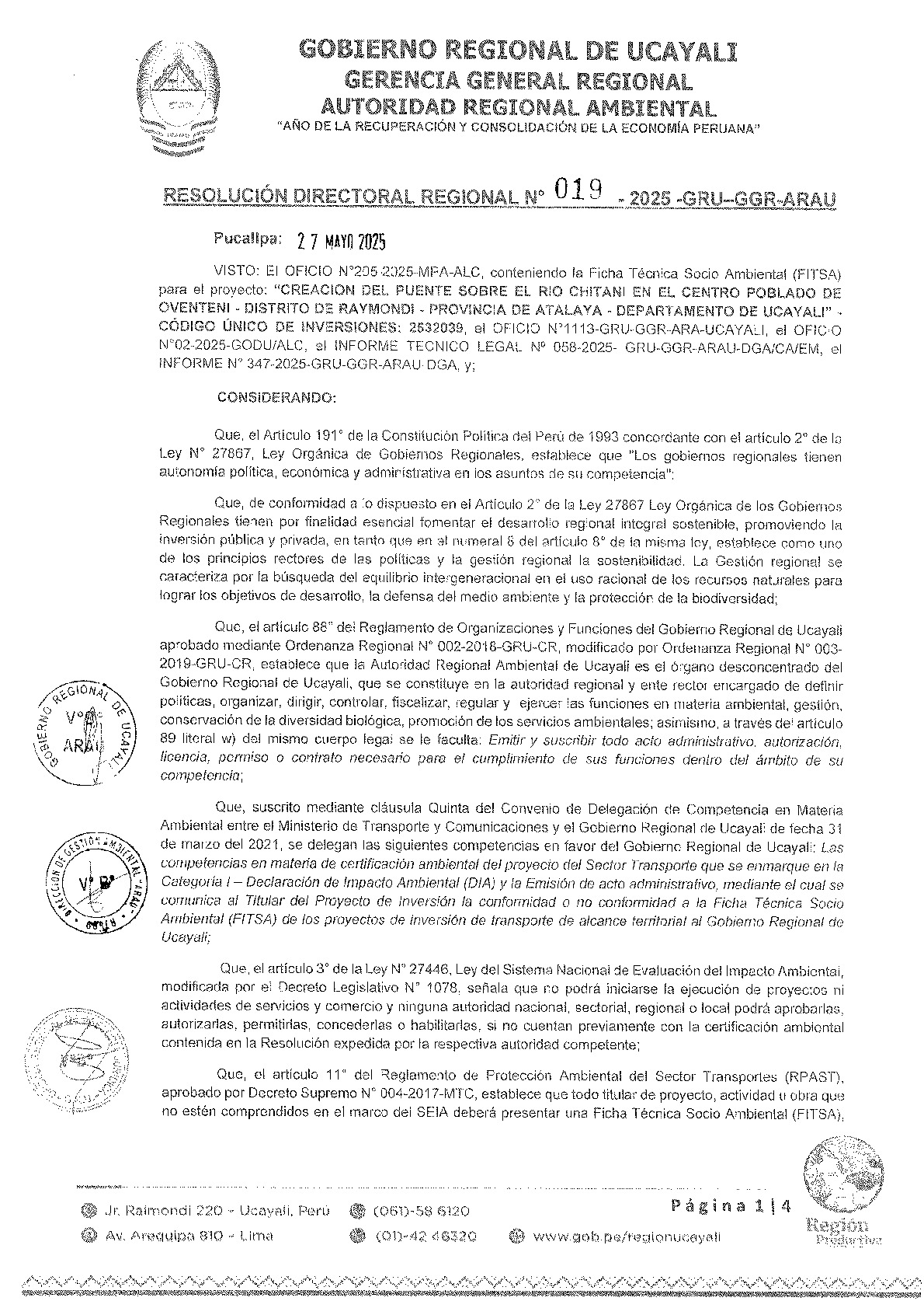 Mediante R.D.R. Nº 019-2025-GRU-GGR-ARAU, el Gobierno Regional de Ucayali, a través de la Autoridad Regional Ambiental, da conformidad al FITSA para el Proyecto: "Creación del Puente sobre el Rio Chitani en el Centro Poblado de Oventeni, Distrito de Raymondi, Provincia de Atalaya, Departamento De Ucayali" CUI 2532039, presentada por la Municipalidad Provincial de Atalaya.