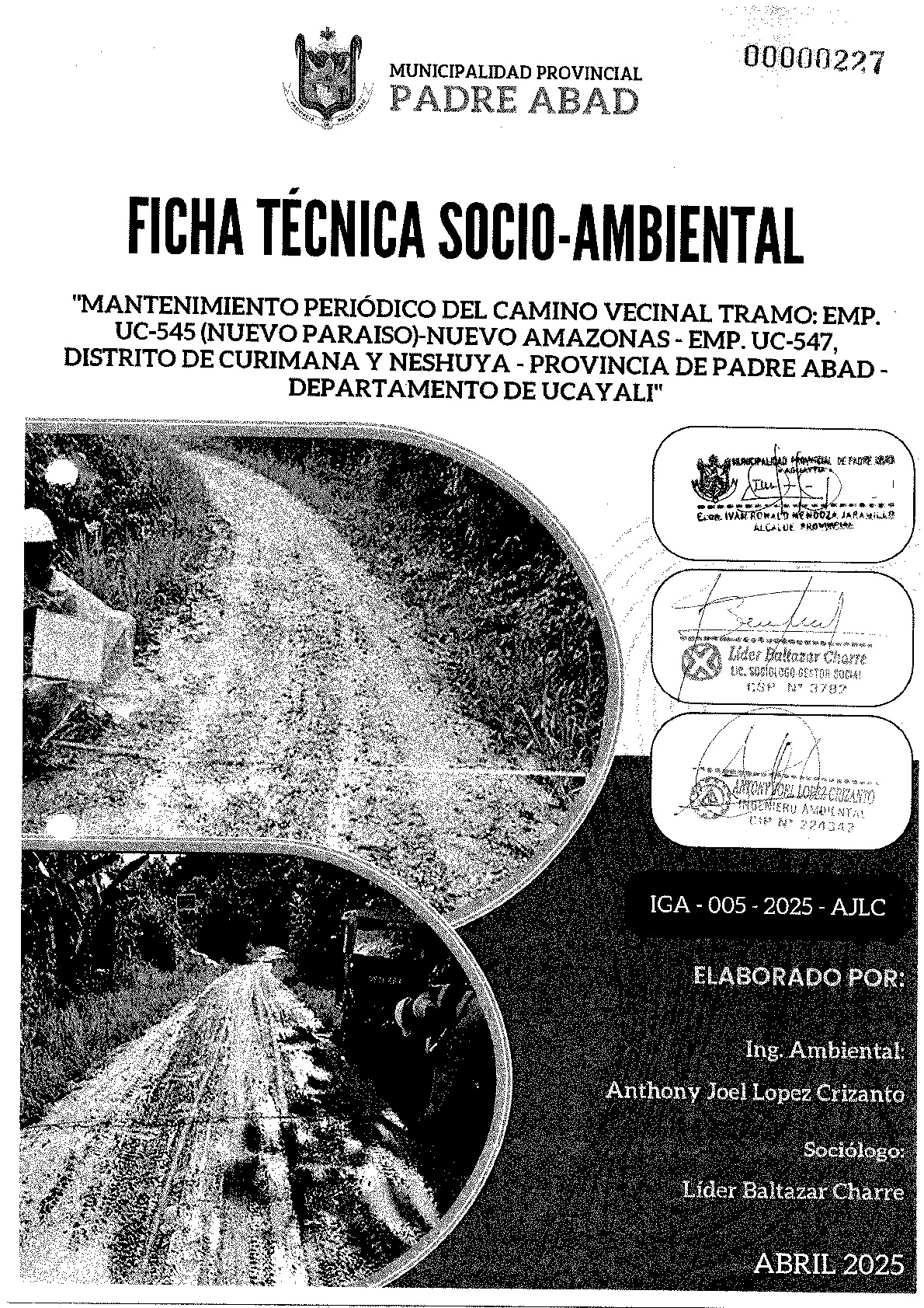 La Autoridad Regional Ambiental de Ucayali, mediante R.D.R. 013-2025-GRU-GGR-ARAU, da el Otorgamiento de Conformidad al FITSA para el Proyecto: "Mantenimiento Periódico del Camino Vecinal tramo: Emp. UC-545 (Nuevo Paraiso) - Nuevo Amazonas - Emp. UC-547, distrito de Curimaná y Neshuya, Provincia de Padre Abad, Departamento de Ucayali, en el distrito de Curimaná, provincia de Padre Abad, departamento de Ucayali.", presentada por la Municipalidad Provincial de Padre Abad