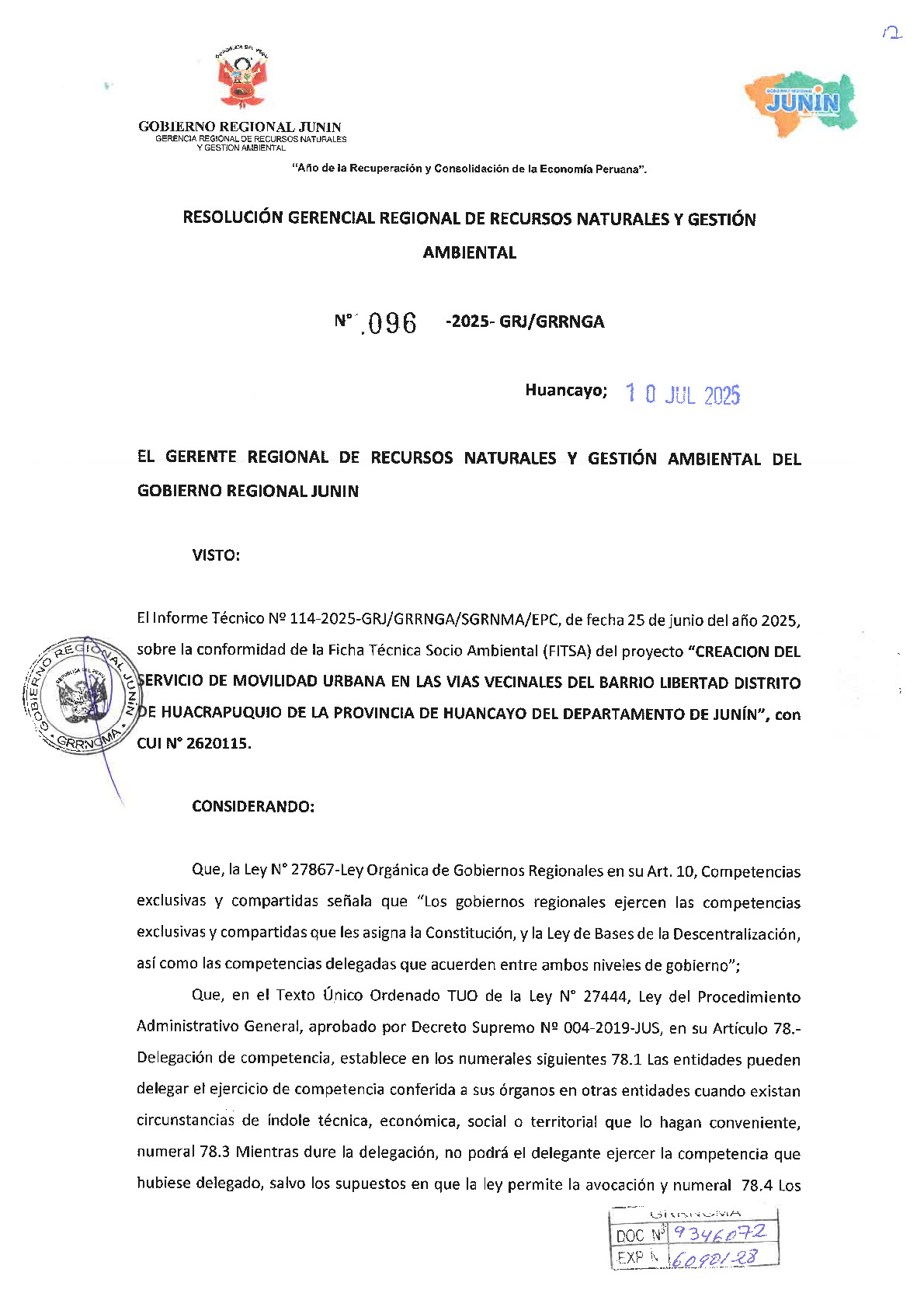 Mediante la Resolución Gerencial Regional N° 096-2025-GRJ/GRRNGA, emitida el 10 de julio de 2025, el Gobierno Regional de Junín otorgó la conformidad a la Ficha Técnica Socio Ambiental (FITSA) y la correspondiente certificación ambiental para el proyecto "Creación del servicio de movilidad urbana en las vías vecinales del barrio Libertad, distrito de Huacrapuquio de la provincia de Huancayo" (CUI N° 2620115). Esta aprobación, sustentada en el Informe Técnico N° 114-2025, valida que el proyecto cumple con los estándares de protección ambiental vigentes para el subsector transportes, permitiendo iniciar la fase de ejecución física de las nuevas pistas y veredas. Con esta resolución, la entidad responsable queda obligada a implementar las medidas de manejo ambiental establecidas y a informar el inicio de las actividades en un plazo de 30 días hábiles para garantizar la debida supervisión y sostenibilidad de la obra en beneficio de la comunidad local.