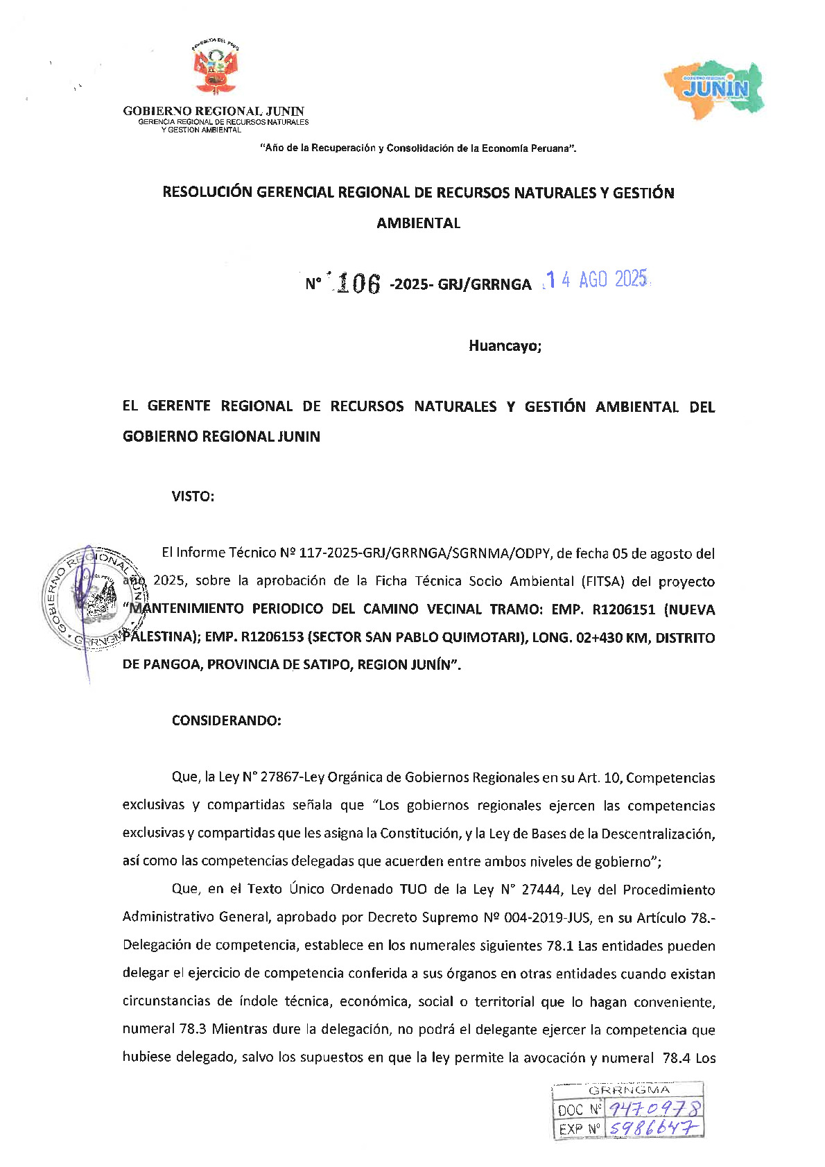 El Gobierno Regional de Junín, a través de la Gerencia Regional de Recursos Naturales y Gestión Ambiental, emitió la Resolución Gerencial Regional N° 106-2025-GRJ/GRRNGA, mediante la cual otorga la conformidad a la Ficha Técnica Socio Ambiental (FITSA) para el proyecto de mantenimiento periódico del camino vecinal que une los sectores de Nueva Palestina y San Pablo Quimotari, en el distrito de Pangoa, provincia de Satipo. Esta certificación ambiental valida la viabilidad del proyecto de 2.43 kilómetros de longitud y establece que la Municipalidad Distrital de Pangoa deberá cumplir con estrictas medidas de manejo de residuos, control de ruidos y protección del entorno natural. Con esta acción, el Gobierno Regional de Junín reafirma su compromiso con el desarrollo de infraestructura vial sostenible que facilite el transporte y el comercio en las zonas rurales de la región.