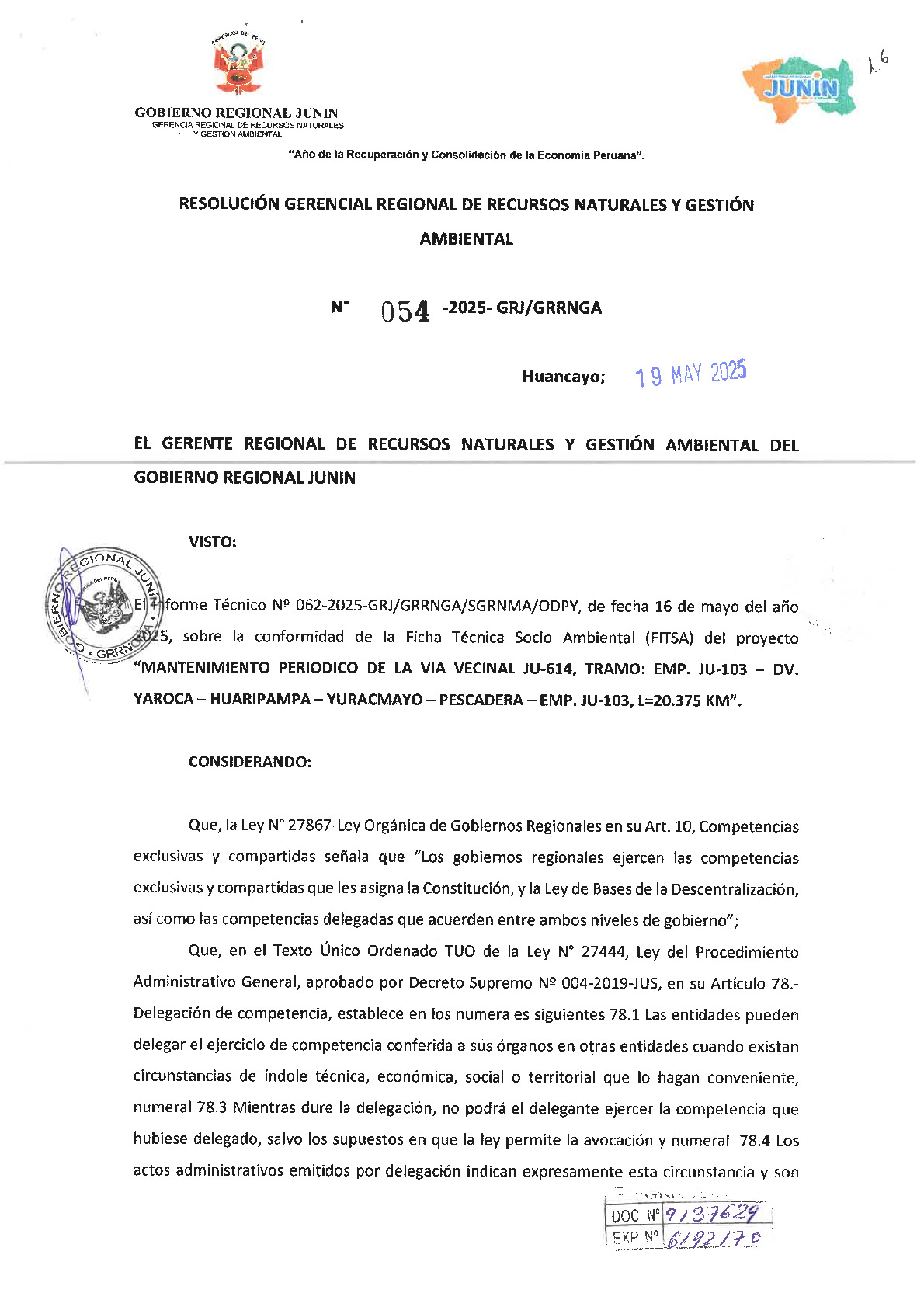 Mediante la Resolución Gerencial Regional N° 054-2025-GRJ/GRRNGA, emitida el 19 de mayo de 2025, el Gobierno Regional de Junín otorgó la conformidad a la Ficha Técnica Socio Ambiental (FITSA) y la correspondiente certificación ambiental para el proyecto "Mantenimiento periódico de la vía vecinal JU-614, tramo: Emp. JU-103 Dv. Yaroca - Huaripampa - Yuracmayo - Pescadera - Emp. JU-103, L=20.375 KM". Esta aprobación, sustentada en el Informe Técnico N° 062-2025, valida que el proyecto cumple con los estándares de protección ambiental vigentes para el subsector transportes, permitiendo asegurar la transitabilidad en este corredor estratégico de más de 20 kilómetros. Con esta resolución, la entidad responsable queda obligada a ejecutar las medidas de manejo ambiental establecidas y a informar el inicio de las actividades en un plazo de 30 días hábiles para garantizar su debida supervisión y el cumplimiento de los compromisos socioambientales.