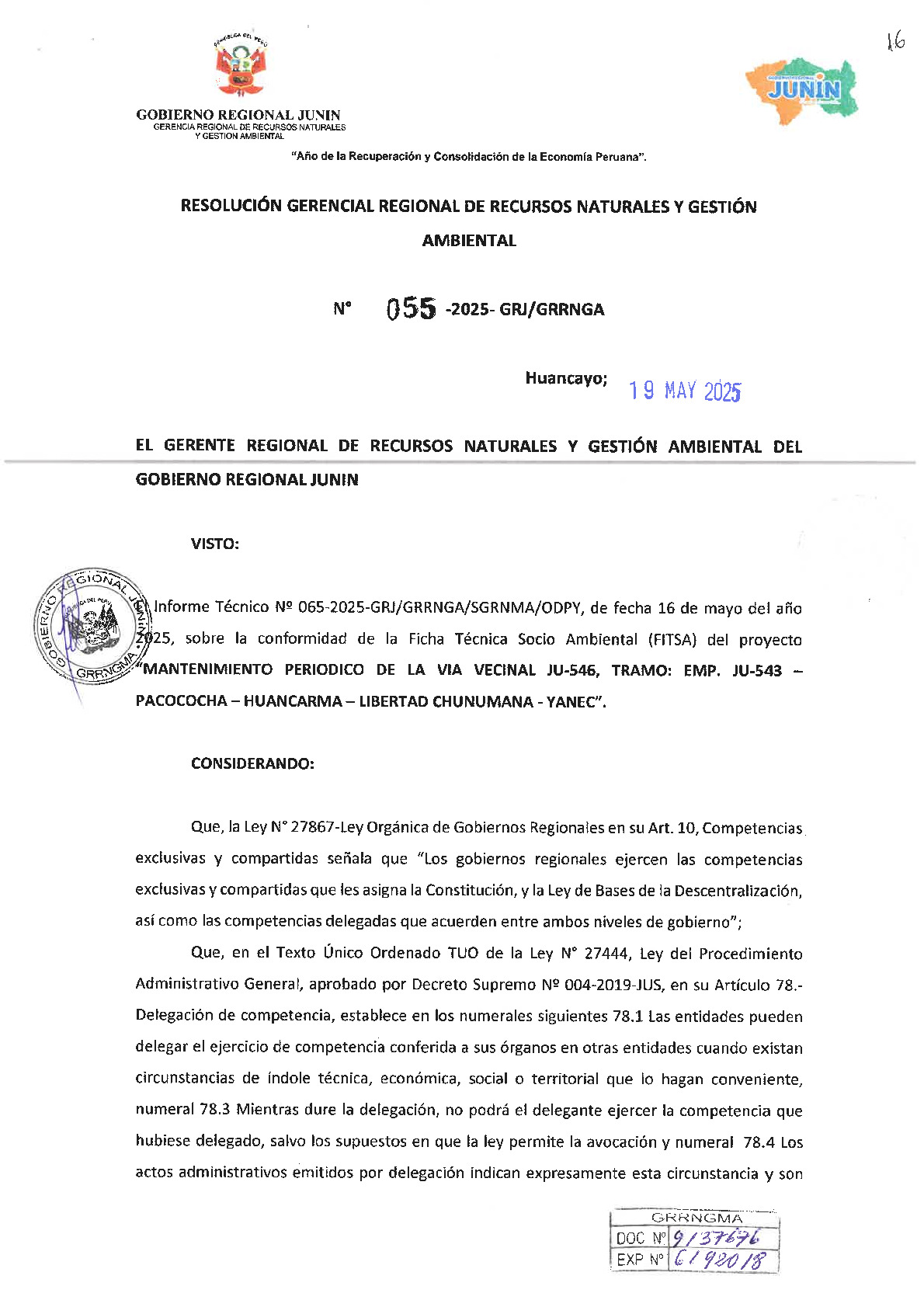 Mediante la Resolución Gerencial Regional N° 055-2025-GRJ/GRRNGA, emitida el 19 de mayo de 2025, el Gobierno Regional de Junín otorgó la conformidad a la Ficha Técnica Socio Ambiental (FITSA) y la correspondiente certificación ambiental para el proyecto "Mantenimiento periódico de la vía vecinal JU-546, tramo: Emp. JU-543 Pacococha - Huancarma - Libertad Chunumana - Yañec". Esta aprobación, sustentada en el Informe Técnico N° 065-2025, confirma que el proyecto cumple con los estándares de protección ambiental vigentes para el subsector transportes, permitiendo asegurar la transitabilidad en este corredor vial. Con esta resolución, la entidad responsable queda obligada a ejecutar las medidas de manejo ambiental establecidas y a informar el inicio de las actividades en un plazo de 30 días hábiles para su debida supervisión y cumplimiento de los compromisos socioambientales.