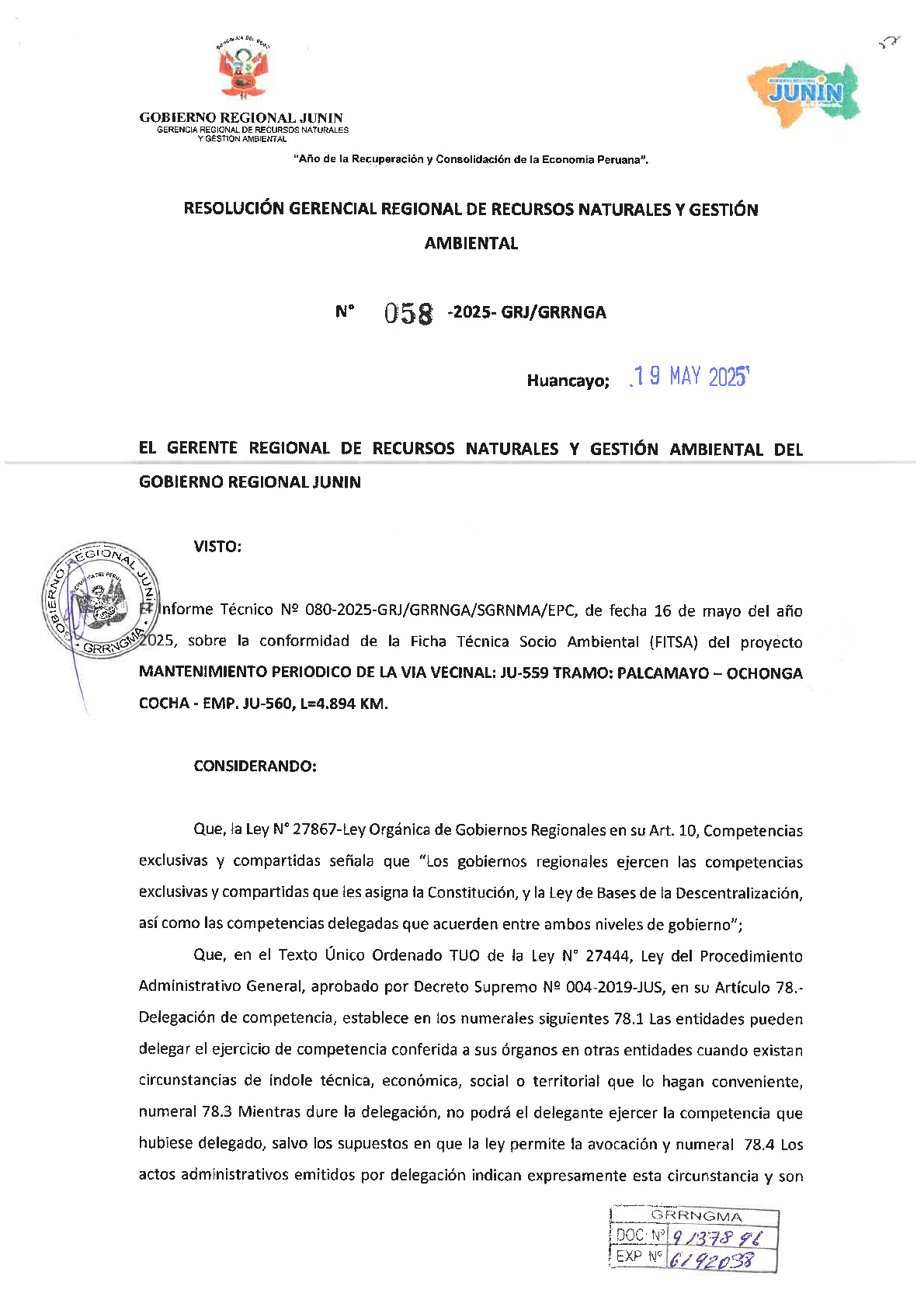 Mediante la Resolución Gerencial Regional N° 058-2025-GRJ/GRRNGA, emitida el 19 de mayo de 2025, el Gobierno Regional de Junín otorgó la conformidad a la Ficha Técnica Socio Ambiental (FITSA) y la correspondiente certificación ambiental para el proyecto "Mantenimiento periódico de la vía vecinal: JU-559 tramo: Palcamayo - Ochonga Cocha - Emp. JU-560, L=4.894 KM". Esta aprobación, sustentada en el Informe Técnico N° 080-2025, valida que el proyecto cumple con los estándares de protección ambiental vigentes para el subsector transportes, permitiendo asegurar la transitabilidad en este tramo de casi 5 kilómetros en la provincia de Tarma. Con esta resolución, la entidad responsable queda obligada a ejecutar las medidas de manejo ambiental establecidas y a informar el inicio de las actividades en un plazo de 30 días hábiles para garantizar la debida supervisión y sostenibilidad de la intervención.