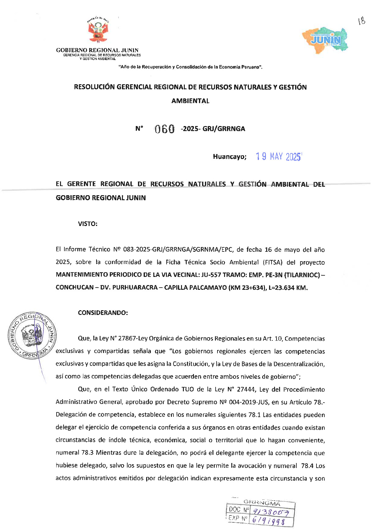 Mediante la Resolución Gerencial Regional N° 060-2025-GRJ/GRRNGA, emitida el 19 de mayo de 2025, el Gobierno Regional de Junín otorgó la conformidad a la Ficha Técnica Socio Ambiental (FITSA) y la correspondiente certificación ambiental para el proyecto "Mantenimiento periódico de la vía vecinal: JU-557 tramo: Emp. PE-3N (Tilarnioc) - Conchucan - Dv. Purhuaracra - Capilla Palcamayo (KM 23+634), L=23.634 KM". Esta aprobación, sustentada en el Informe Técnico N° 083-2025, valida que el proyecto cumple con los estándares de protección ambiental vigentes para el subsector transportes, permitiendo asegurar la transitabilidad en este corredor estratégico de más de 23 kilómetros en la provincia de Tarma. Con esta resolución, la entidad responsable queda obligada a ejecutar las medidas de manejo ambiental establecidas y a informar el inicio de las actividades en un plazo de 30 días hábiles para garantizar su debida supervisión y sostenibilidad.