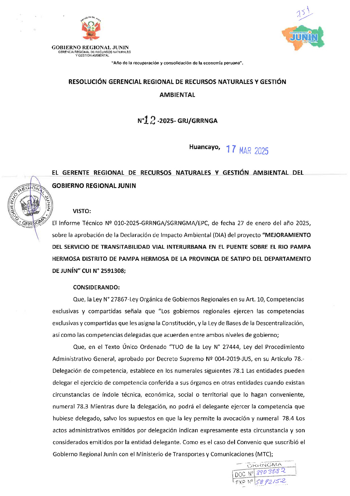 El Gobierno Regional de Junín, mediante la Resolución Gerencial Regional N° 12-2025-GRJ/GRRNGA emitida el 17 de marzo de 2025, aprobó la Declaración de Impacto Ambiental (DIA) para el proyecto de "Mejoramiento del servicio de transitabilidad vial interurbana en el puente sobre el río Pampa Hermosa", ubicado en la provincia de Satipo. Esta certificación ambiental se otorgó tras determinarse que el proyecto no se encuentra en áreas naturales protegidas ni afectará directamente cuerpos de agua, permitiendo así avanzar hacia la ejecución de la obra bajo el compromiso de la Municipalidad Distrital de Pampa Hermosa de cumplir estrictamente con el Plan de Manejo Ambiental establecido.