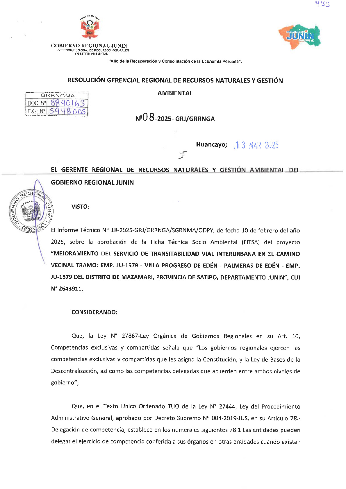 La Resolución Gerencial Regional N° 08-2025-GRJ/GRRNGA, emitida el 13 de marzo de 2025, oficializa la aprobación de la Ficha Técnica Socio Ambiental (FITSA) para el proyecto de "Mejoramiento del servicio de transitabilidad vial interurbana en el tramo Villa Progreso de Edén - Palmeras de Edén", en el distrito de Mazamari, provincia de Satipo. A través de este acto administrativo, el Gobierno Regional de Junín otorga la certificación ambiental necesaria para la ejecución de la obra, validando que el proyecto cumple con los lineamientos de protección ambiental y estableciendo la obligatoriedad de implementar medidas de mitigación de impactos, manejo de residuos y control de ruidos, bajo la supervisión de las autoridades competentes para asegurar la sostenibilidad ambiental en la zona.