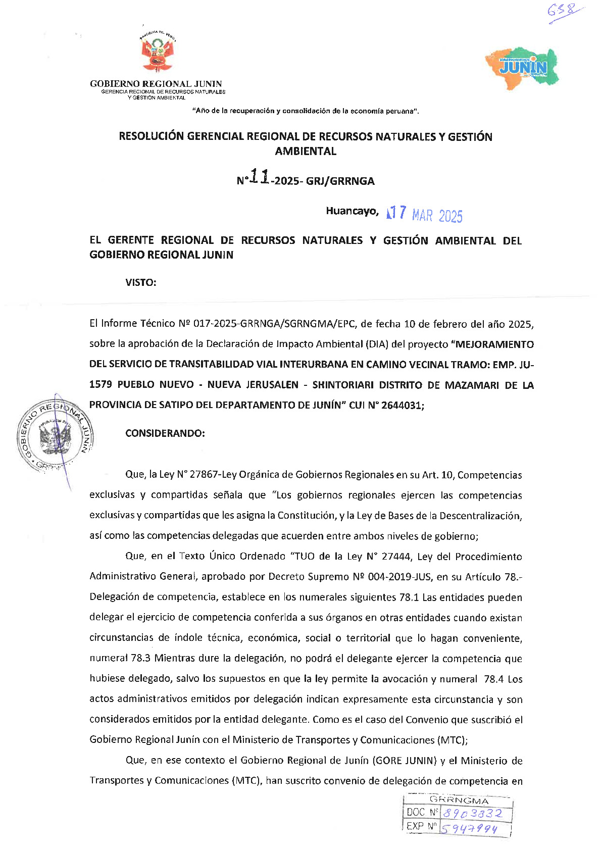 La Resolución Gerencial Regional N° 11-2025-GRJ/GRRNGA, emitida el 17 de marzo de 2025, oficializa la aprobación de la Declaración de Impacto Ambiental (DIA) para el proyecto de "Mejoramiento del servicio de transitabilidad vial interurbana en el tramo Pueblo Nuevo - Nueva Jerusalén - Shintoriari", ubicado en el distrito de Mazamari, provincia de Satipo. Mediante este acto, el Gobierno Regional de Junín otorga la certificación ambiental necesaria para la ejecución de la obra, validando que la propuesta cumple con los estándares técnicos y legales para la prevención de impactos ambientales negativos, al tiempo que establece la responsabilidad del ejecutor de implementar medidas de mitigación, control de residuos y protección del ecosistema, quedando sujeto a fiscalizaciones periódicas para garantizar el cumplimiento de los compromisos socioambientales.