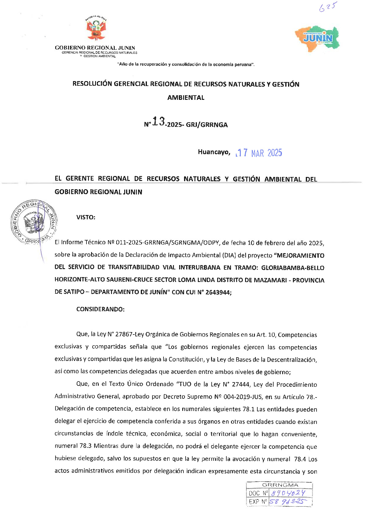 El Gobierno Regional de Junín, a través de la Resolución Gerencial Regional N° 13-2025-GRJ/GRRNGA, aprobó la Declaración de Impacto Ambiental (DIA) para el proyecto de "Mejoramiento del servicio de transitabilidad vial interurbana" en el tramo que conecta Gloriabamba, Bello Horizonte, Alto Saureni y el Cruce Sector Loma Linda, en el distrito de Mazamari. Esta aprobación se otorgó tras confirmar que la obra no afecta áreas naturales protegidas ni cuerpos de agua, estableciendo que la Municipalidad Distrital de Mazamari, como titular del proyecto, queda obligada a cumplir estrictamente con el Plan de Manejo Ambiental. Cabe precisar que esta certificación ambiental representa la viabilidad del proyecto en dicha materia, pero no exime al titular de la obtención de otras licencias y permisos legales necesarios antes del inicio físico de las actividades de construcción.