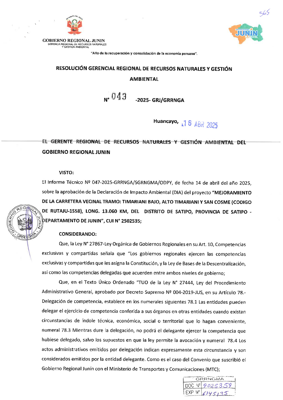 Mediante la Resolución Gerencial Regional N° 043-2025-GRJ/GRRNGA, con fecha 21 de abril de 2025, el Gobierno Regional de Junín aprobó la Declaración de Impacto Ambiental (DIA) y otorgó la correspondiente certificación ambiental al proyecto "Mejoramiento de la carretera vecinal tramo: Timariani Bajo, Alto Timariani y San José, distrito de Perené, provincia de Chanchamayo" (CUI N° 2228771). Esta aprobación, sustentada en el Informe Técnico N° 046-2025, confirma que el proyecto cumple con los estándares de protección ambiental vigentes y no genera impactos negativos significativos en áreas protegidas. Con este acto administrativo, el titular queda facultado para avanzar con la inversión, bajo el compromiso de cumplir estrictamente con el Plan de Manejo Ambiental y las medidas de mitigación social establecidas para garantizar un desarrollo sostenible en la selva central.