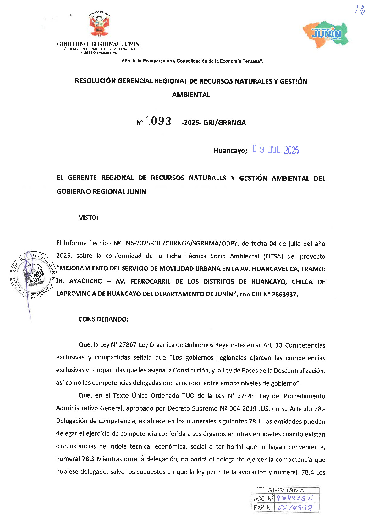 Mediante la Resolución Gerencial Regional N° 093-2025-GRJ/GRRNGA, emitida el 9 de julio de 2025, el Gobierno Regional de Junín otorgó la conformidad a la Ficha Técnica Socio Ambiental (FITSA) y la correspondiente certificación ambiental para el proyecto "Mejoramiento del servicio de movilidad urbana en la Av. Huancavelica, tramo: Jr. Ayacucho - Av. Ferrocarril de los distritos de Huancayo y Chilca" (CUI N° 2663937). Esta aprobación, sustentada en el Informe Técnico N° 096-2025, certifica que el proyecto cumple con los estándares de protección ambiental vigentes para el subsector transportes, permitiendo avanzar con la ejecución de esta obra clave para la conectividad metropolitana. Con esta resolución, la entidad responsable queda obligada a cumplir con las medidas de manejo ambiental establecidas y a informar el inicio de las actividades en un plazo de 30 días hábiles para su debida supervisión.