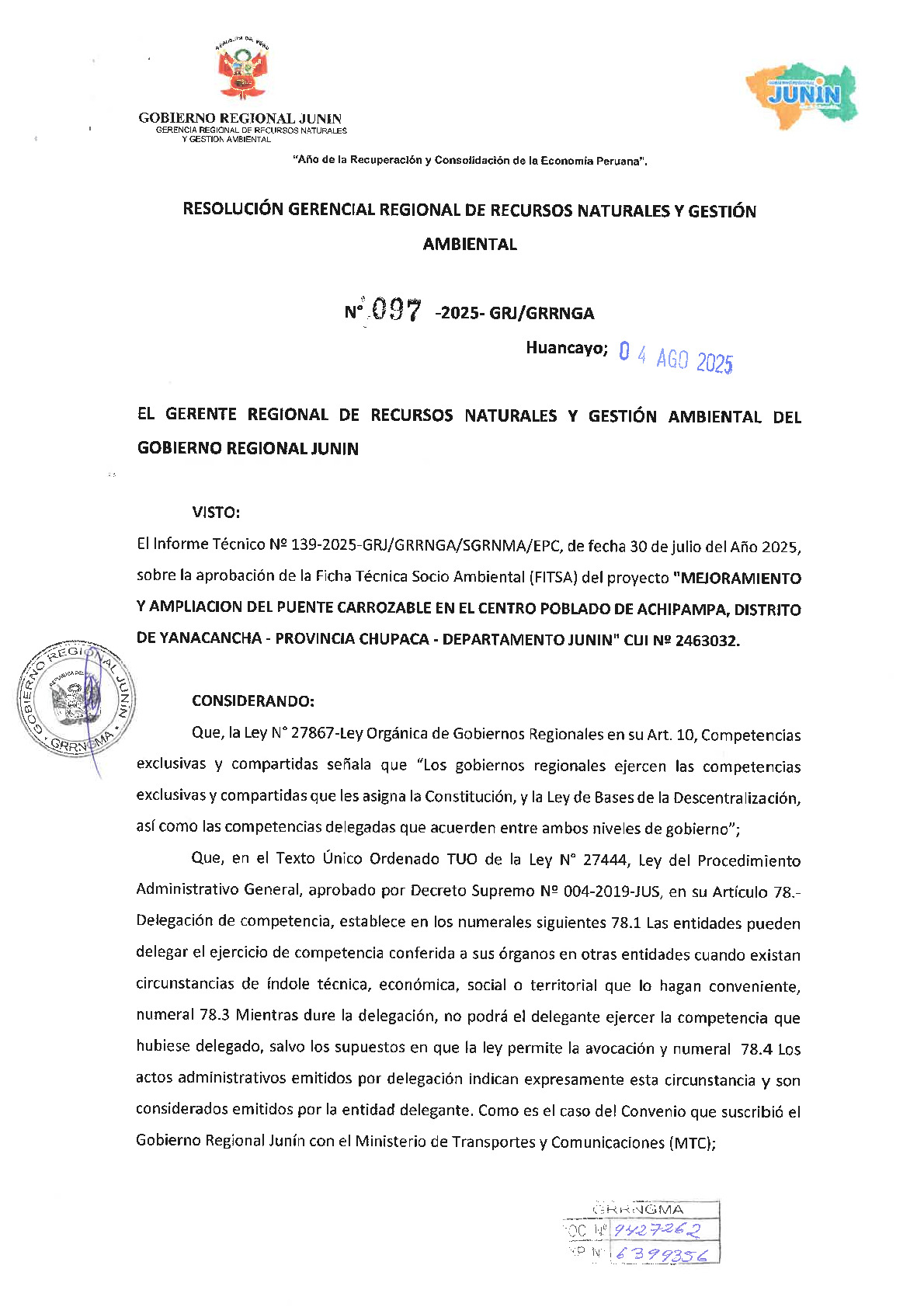 Mediante la Resolución Gerencial Regional N° 097-2025-GRJ/GRRNGA, emitida el 4 de agosto de 2025, el Gobierno Regional de Junín otorgó la conformidad a la Ficha Técnica Socio Ambiental (FITSA) y la correspondiente certificación ambiental para el proyecto "Mejoramiento y ampliación del puente carrozable en el centro poblado de Achipampa, distrito de Yanacancha - provincia Chupaca - departamento Junín" (CUI N° 2463032). Esta aprobación, sustentada en el Informe Técnico N° 139-2025, certifica que la obra cumple con los estándares de protección ambiental vigentes para el subsector transportes. Con esta resolución, la entidad responsable queda obligada a implementar estrictamente las medidas de manejo ambiental establecidas y a informar el inicio de las actividades en un plazo de 30 días hábiles para garantizar la debida supervisión y sostenibilidad de la infraestructura en beneficio de la población de Achipampa.