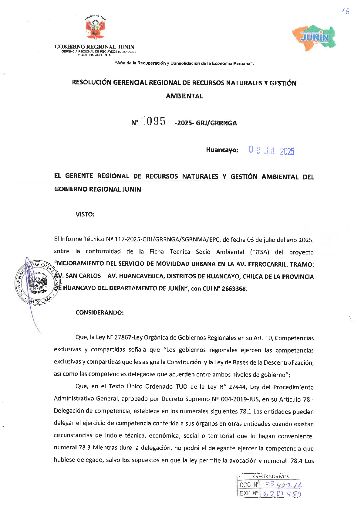 Mediante la Resolución Gerencial Regional N° 095-2025-GRJ/GRRNGA, emitida el 9 de julio de 2025, el Gobierno Regional de Junín otorgó la conformidad a la Ficha Técnica Socio Ambiental (FITSA) y la correspondiente certificación ambiental para el proyecto "Mejoramiento del servicio de movilidad urbana en la Av. Ferrocarril, tramo: Av. San Carlos - Av. Huancavelica, distritos de Huancayo, Chilca de la provincia de Huancayo" (CUI N° 2663368). Esta aprobación, sustentada en el Informe Técnico N° 117-2025, certifica que el proyecto cumple con los estándares de protección ambiental vigentes para el subsector transportes, permitiendo avanzar con la ejecución de esta obra estratégica para el ordenamiento del tránsito metropolitano. Con esta resolución, la entidad responsable queda obligada a implementar estrictamente las medidas de manejo ambiental establecidas y a informar el inicio de las actividades en un plazo de 30 días hábiles para su debida supervisión.