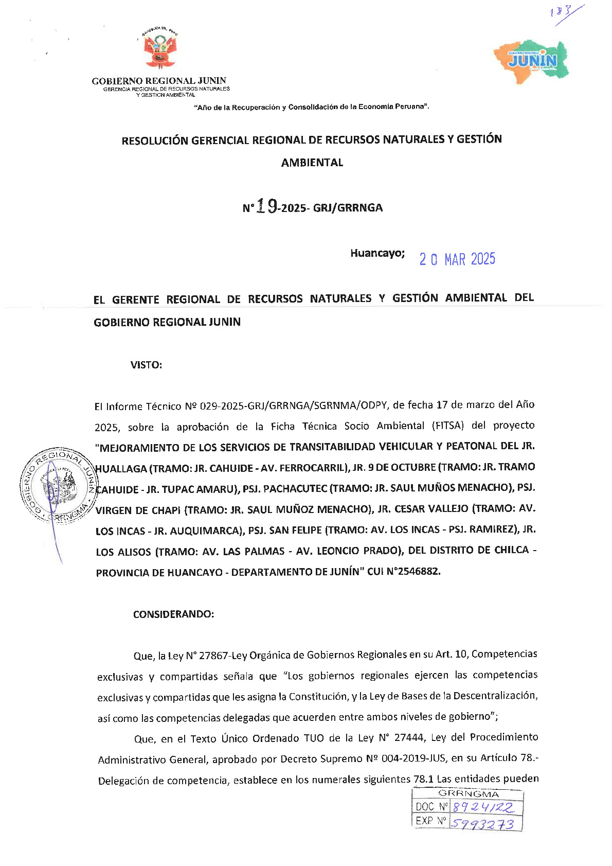 El Gobierno Regional de Junín, mediante la Resolución Gerencial Regional N° 19-2025-GRJ/GRRNGA, otorgó la conformidad a la Ficha Técnica Socio Ambiental (FITSA) para el proyecto de "Mejoramiento de los servicios de transitabilidad vehicular y peatonal" en diversos sectores del distrito de Chilca, provincia de Huancayo, que incluyen tramos de los jirones Huallaga, 9 de Octubre, César Vallejo y los pasajes Pachacútec y Virgen de Chapi. Esta certificación ambiental valida que la obra cumple con la normativa de protección para el sector transportes, al no interferir con áreas naturales protegidas ni ecosistemas frágiles, estableciendo que la Municipalidad Distrital de Chilca debe ejecutar las medidas de mitigación para el control de polvo, ruidos y gestión de residuos. Con esta resolución, el proyecto queda habilitado ambientalmente para continuar con sus fases administrativas y la obtención de permisos específicos antes del inicio de los trabajos físicos.