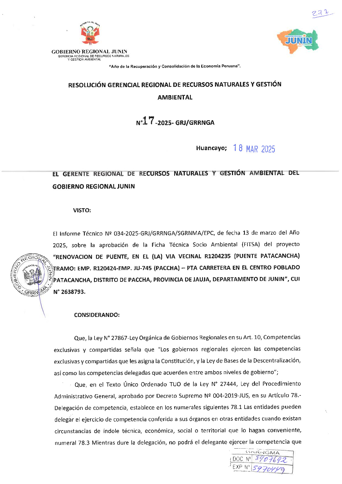 l Gobierno Regional de Junín, a través de la Gerencia Regional de Recursos Naturales y Gestión Ambiental, emitió la Resolución Gerencial Regional N° 17-2025-GRJ/GRRNGA que otorga la conformidad a la Ficha Técnica Socio Ambiental (FITSA) para el proyecto de "Renovación de puente en la vía vecinal R1204235 (Puente Patacancha)", ubicado en el distrito de Paccha, provincia de Jauja. Esta aprobación certifica que el proyecto cumple con las normas de protección ambiental para el sector transportes, al no ubicarse en áreas naturales protegidas ni afectar ecosistemas críticos. Con este paso, la Municipalidad Distrital de Paccha queda facultada para avanzar en las gestiones administrativas, manteniendo la responsabilidad de implementar medidas de mitigación para el control de polvo, ruidos y manejo de residuos durante la ejecución de la obra.