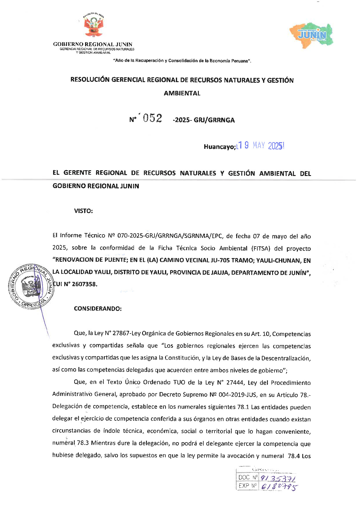 Mediante la Resolución Gerencial Regional N° 052-2025-GRJ/GRRNGA, emitida el 19 de mayo de 2025, el Gobierno Regional de Junín otorgó la conformidad a la Ficha Técnica Socio Ambiental (FITSA) y la correspondiente certificación ambiental para el proyecto "Renovación de puente; en el (la) camino vecinal JU-705 tramo: Yauli-Chunán, en la localidad Yauli, distrito de Yauli, provincia de Jauja" (CUI N° 2607358). Esta aprobación, sustentada en el Informe Técnico N° 070-2025, valida que el proyecto cumple con las normativas ambientales vigentes para el subsector transportes, permitiendo avanzar hacia la fase de inversión. Con esta resolución, la entidad responsable queda obligada a ejecutar la obra siguiendo estrictamente las medidas de mitigación y manejo ambiental establecidas, además de informar el inicio de las actividades en un plazo de 30 días hábiles para su debida supervisión y fiscalización.