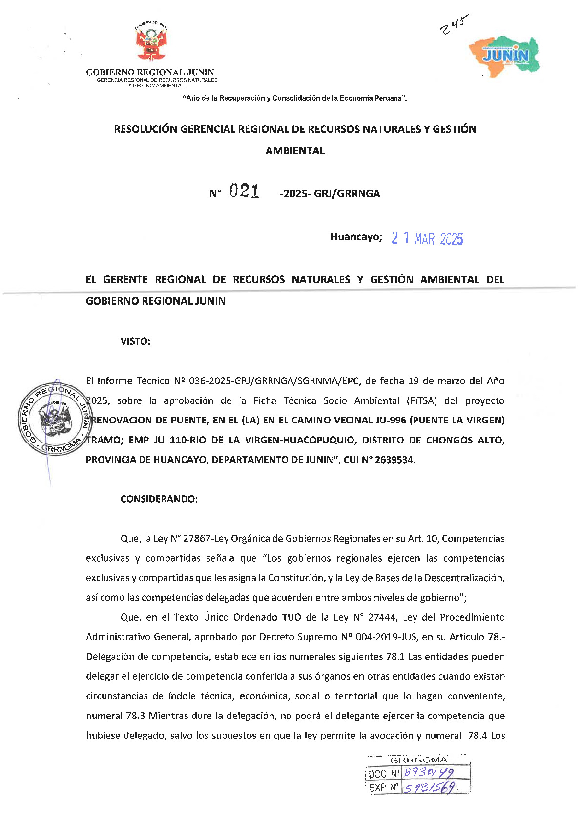 El Gobierno Regional de Junín, a través de la Gerencia Regional de Recursos Naturales y Gestión Ambiental, emitió la Resolución Gerencial Regional N° 021-2025-GRJ/GRRNGA que otorga la conformidad a la Ficha Técnica Socio Ambiental (FITSA) para el proyecto de "Renovación de puente en el camino vecinal JU-996 (Puente La Virgen)", en el tramo Emp. JU 110 - Río de la Virgen - Huacopuquio, distrito de Chongos Alto, provincia de Huancayo. Esta certificación ambiental asegura que la obra cumple con la normativa técnica y de protección ambiental para el sector transportes, al no interferir con áreas naturales protegidas ni ecosistemas frágiles. Con esta aprobación, el titular del proyecto queda obligado a implementar medidas de manejo ambiental para mitigar ruidos, emisiones y residuos, debiendo gestionar adicionalmente las autorizaciones correspondientes ante la Autoridad Nacional del Agua antes del inicio físico de los trabajos.