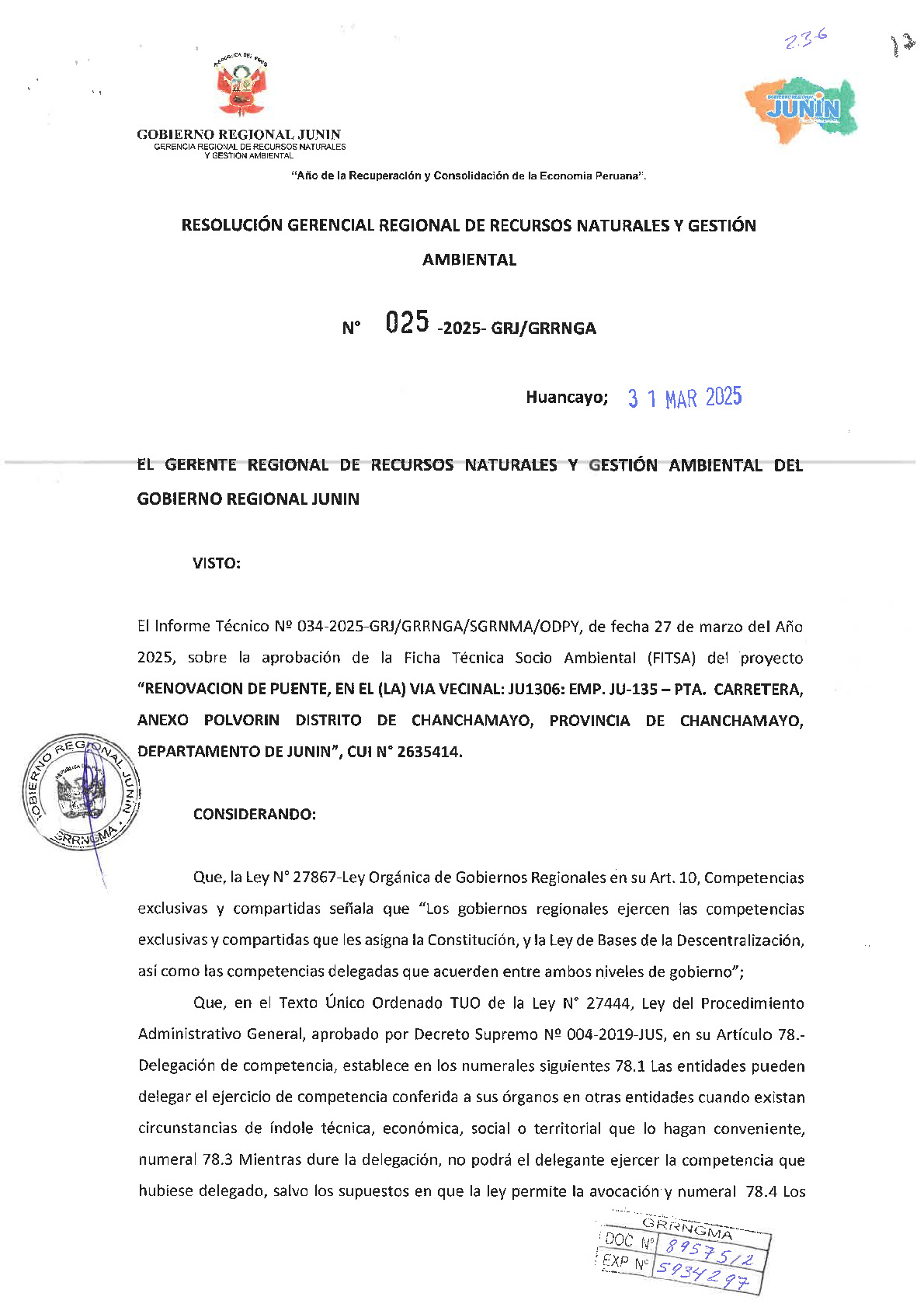 El Gobierno Regional de Junín, a través de la Gerencia Regional de Recursos Naturales y Gestión Ambiental, emitió la Resolución Gerencial Regional N° 025-2025-GRJ/GRRNGA que otorga la conformidad a la Ficha Técnica Socio Ambiental (FITSA) para el proyecto de "Renovación de puente en la vía vecinal: JU1306: Emp. JU-135 - Pta. Carretera", ubicado en el anexo Polvorín, distrito y provincia de Chanchamayo. Esta certificación ambiental asegura que la obra cumple con la normativa técnica para el sector transportes al no afectar áreas naturales protegidas ni ecosistemas frágiles, estableciendo que la entidad ejecutora debe implementar estrictamente el Plan de Manejo Ambiental para el control de residuos, ruidos y emisiones. Con esta aprobación, el proyecto alcanza la viabilidad ambiental necesaria para proseguir con sus etapas administrativas y la obtención de permisos adicionales antes de iniciar la ejecución física de la infraestructura.
