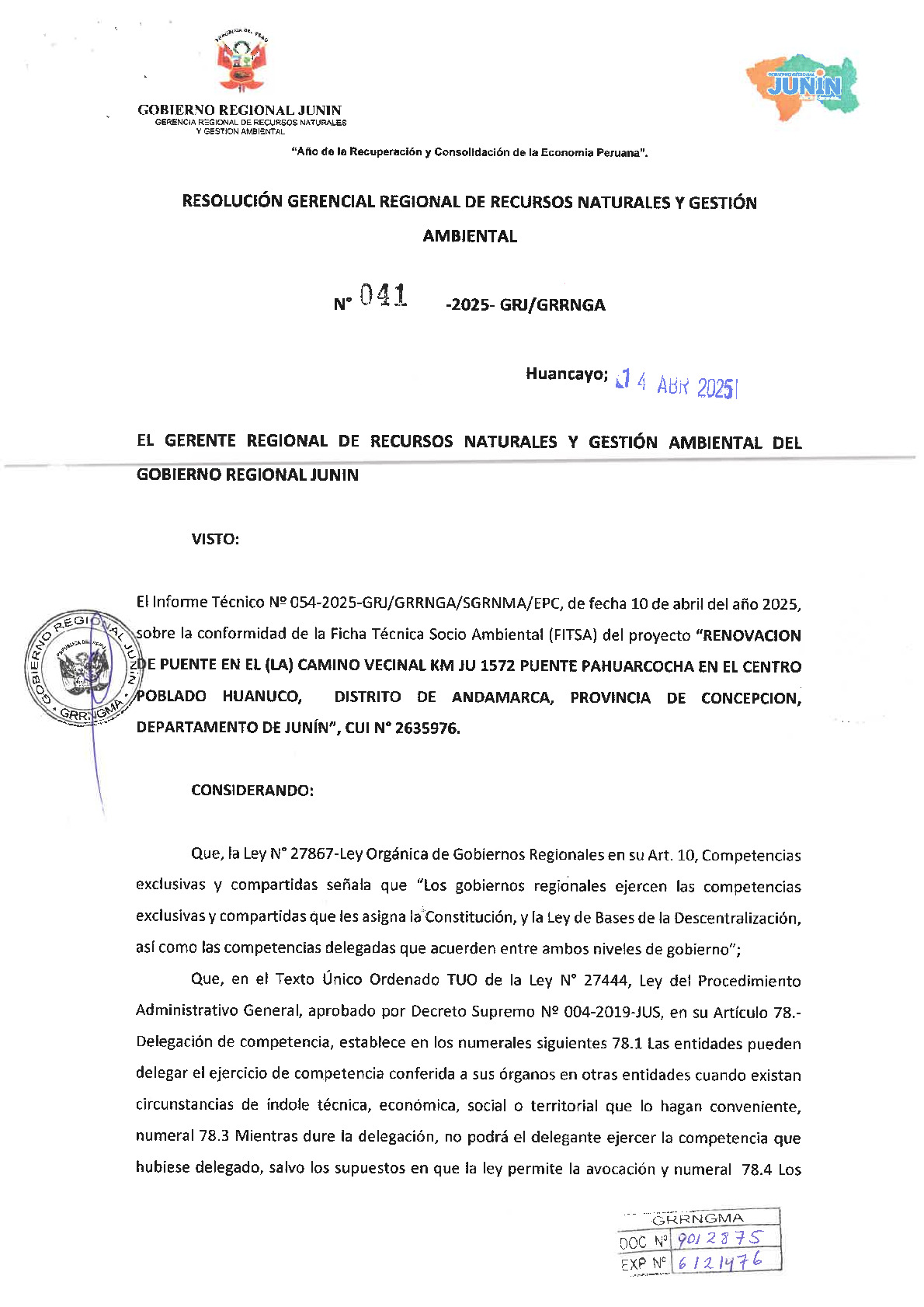 Mediante la Resolución Gerencial Regional N° 041-2025-GRJ/GRRNGA, emitida el 14 de abril de 2025, el Gobierno Regional de Junín otorgó la conformidad a la Ficha Técnica Socio Ambiental (FITSA) y la correspondiente certificación ambiental para el proyecto "Renovación de puente en el (la) camino vecinal KM JU 1572 puente Pahuarcocha en el centro poblado Huánuco, distrito de Andamarca, provincia de Concepción" (CUI N° 2635976). Esta aprobación, sustentada en el Informe Técnico N° 054-2025, valida que el proyecto cumple con las normativas ambientales vigentes para el subsector transportes, permitiendo así el inicio de las fases de inversión. Con esta resolución, la entidad responsable queda obligada a ejecutar el proyecto siguiendo estrictamente las medidas de mitigación y manejo ambiental establecidas, además de informar el inicio de las actividades en un plazo de 30 días hábiles para su debida supervisión.