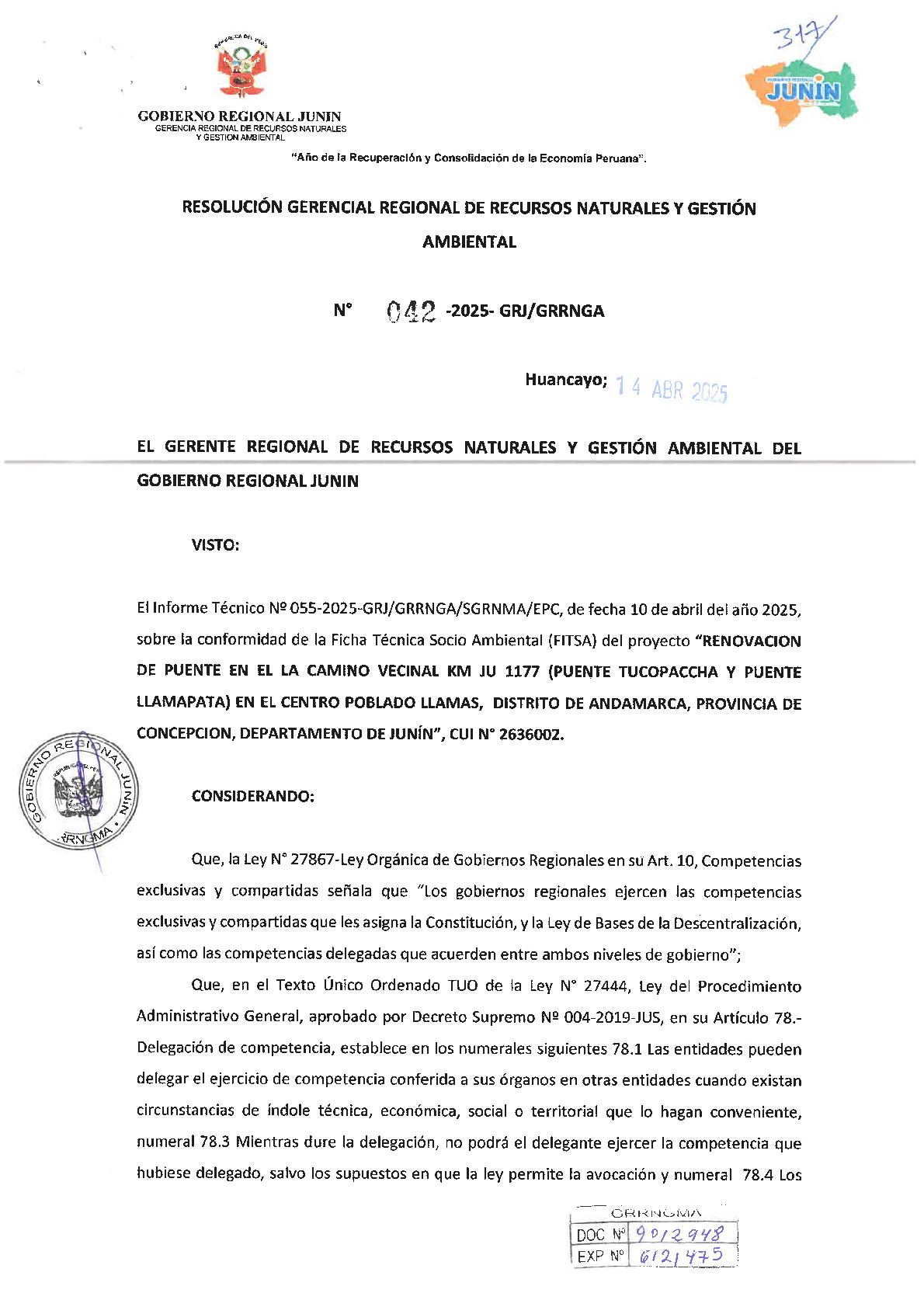Mediante la Resolución Gerencial Regional N° 042-2025-GRJ/GRRNGA, emitida el 14 de abril de 2025, el Gobierno Regional de Junín otorgó la conformidad a la Ficha Técnica Socio Ambiental (FITSA) y la correspondiente certificación ambiental para el proyecto "Renovación de puente en el (la) camino vecinal KM JU 1177 (Puente Tucopaccha y Puente Llamapata) en el centro poblado Llamas, distrito de Andamarca, provincia de Concepción" (CUI N° 2636002). Esta aprobación, sustentada en el Informe Técnico N° 055-2025, confirma que el proyecto cumple con los estándares ambientales para el subsector transportes, permitiendo avanzar hacia la fase de ejecución. Con este acto, la entidad ejecutora queda obligada a cumplir estrictamente con las medidas de mitigación y manejo ambiental establecidas, además de informar el inicio de las obras en un plazo de 30 días hábiles para su debida supervisión y control.