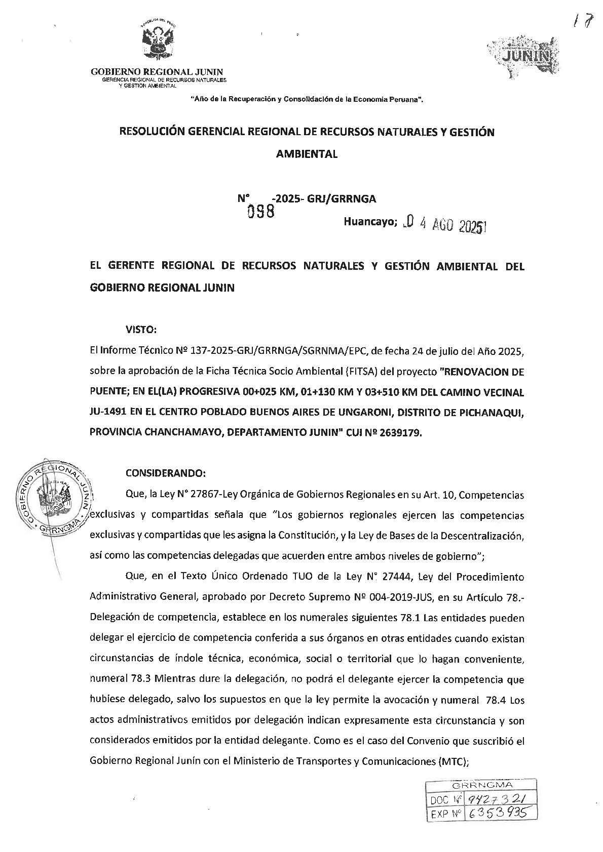 Mediante la Resolución Gerencial Regional N° 098-2025-GRJ/GRRNGA, emitida el 4 de agosto de 2025, el Gobierno Regional de Junín otorgó la conformidad a la Ficha Técnica Socio Ambiental (FITSA) y la correspondiente certificación ambiental para el proyecto "Renovación de puente; en el (la) progresiva 00+025 KM, 01+130 KM y 03+510 KM del camino vecinal JU-1491 en el Centro Poblado Buenos Aires de Ungaroni, distrito de Pichanaqui, provincia Chanchamayo, departamento Junín" (CUI N° 2639179). Esta aprobación, sustentada en el Informe Técnico N° 137-2025, valida que la obra cumple con los estándares de protección ambiental vigentes para el subsector transportes, permitiendo asegurar la infraestructura necesaria para una transitabilidad segura en la Selva Central. Con esta resolución, la entidad responsable queda obligada a ejecutar estrictamente las medidas de manejo ambiental establecidas y a informar el inicio de las actividades en un plazo de 30 días hábiles para garantizar la debida supervisión y sostenibilidad de la obra.